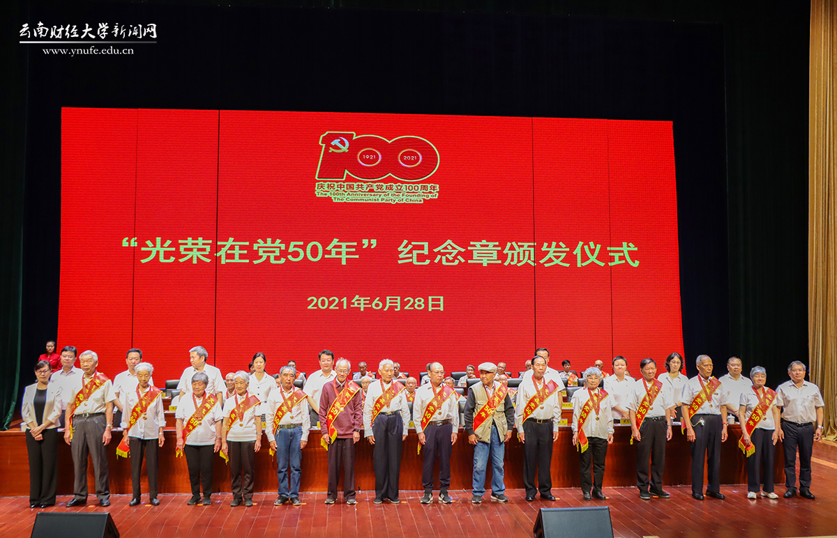 6月28日下午,中国共产党成立100周年十大买球官方网站“两优一先”表彰大会在龙泉路校区北院汇文礼堂隆重举行。大会为买球39位党龄50年以上的老党员代表颁发“光荣在党50年”纪念章,举行“两优一先”颁奖仪式以激励全校各级党组织和广大党员向先进学习、向先进看齐。