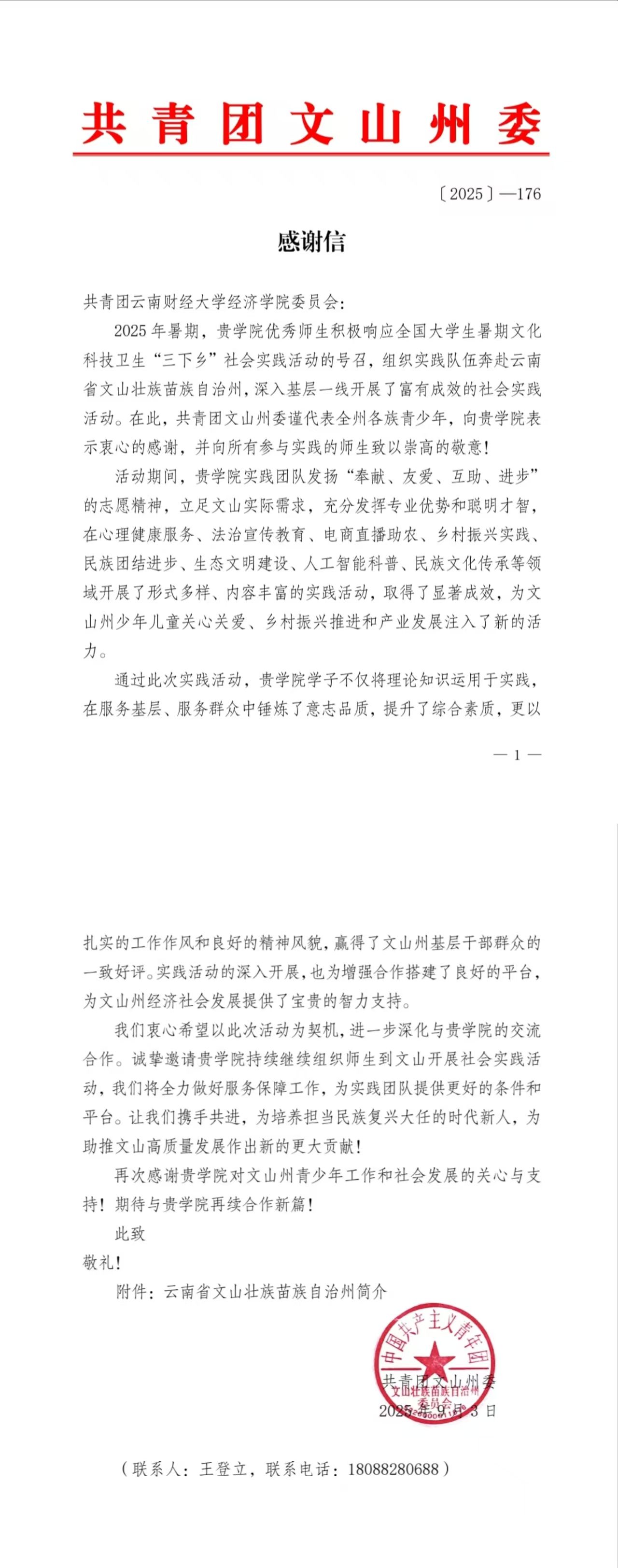 近日,共青团文山州委向经济学院团委致感谢信,对学院2025年暑期“三下乡”社会实践团队在文山州开展的系列实践活动给予高度评价,并表达诚挚谢意。