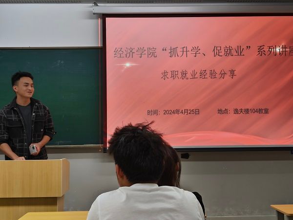 2024年4月25日晚,经济学院在逸夫楼104举办“职”点迷津就业指导讲座之2024届优秀毕业生代表就业经验分享会。