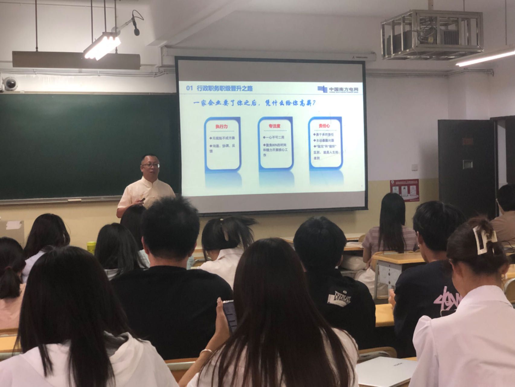 为帮助大学生深入了解就业形势,顺利完成学职转换,经济学院于4月29日晚,在凌云楼北501举办“职”点迷津就业指导系列讲座之职场适应专题,本次讲座邀请南方电网供应链(云南)有限公司党建人事部副主任刘炎担任主讲。