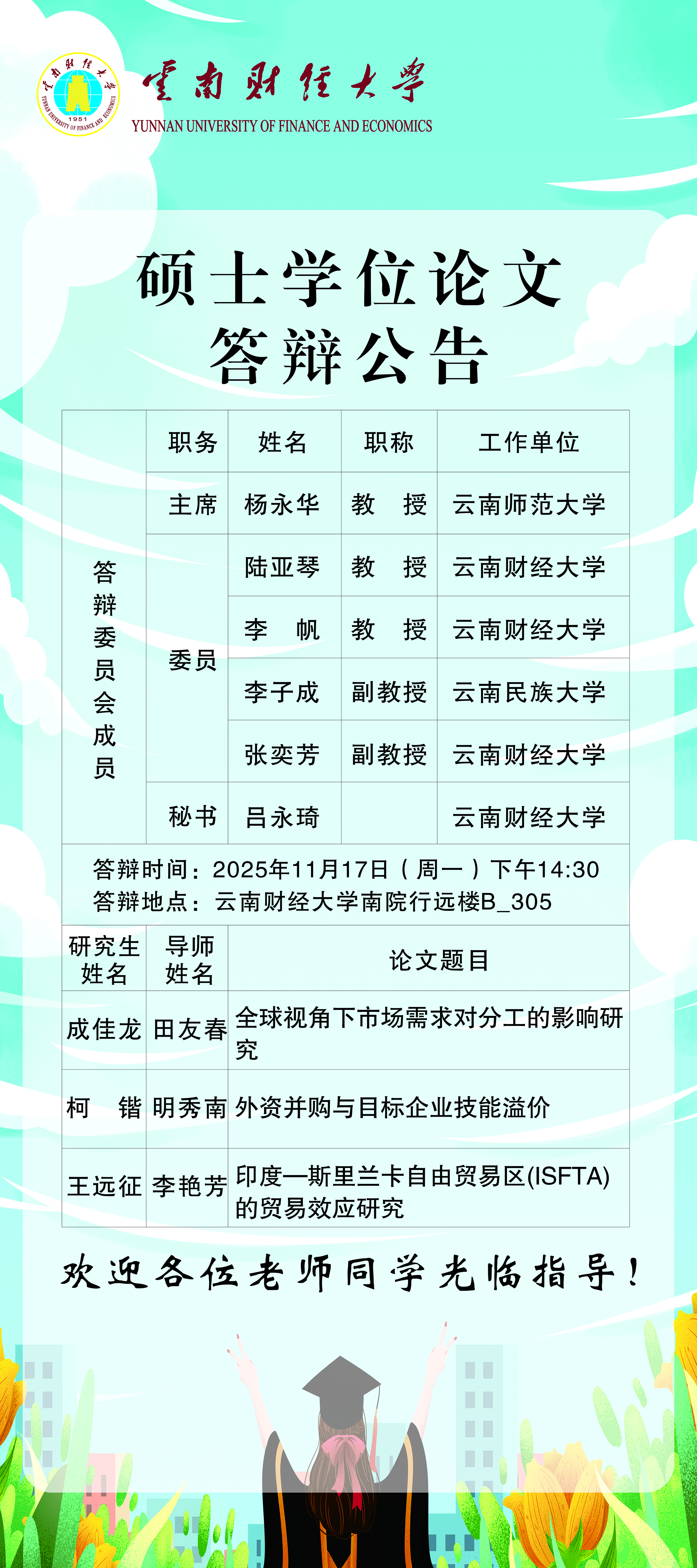 经济学院2025年秋季学期硕士学位论文答辩公告