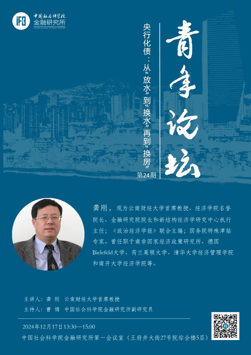 2024年12月17日下午,由中国社会科学院金融研究所主办的青年论坛第24期在北京举行。十大买球官方网站首席教授龚刚应邀参加,并作题为《央行化债:从“放水”到换水再到换房》的主题演讲。