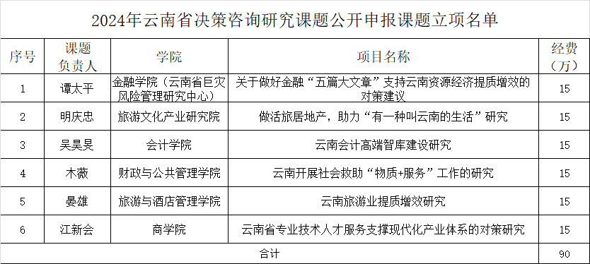 近日,云南省社会科学界联合会公示了“2024年云南省决策咨询研究课题公开申报课题立项名单”,全省总计拟立项32项,涉及25家单位,买球拟立项6项,每个项目拟资助经费15万元,总经费90万元,在云南省所有申报此类项目单位中位列第一,是买球历年来取得的最好成绩。在此,向拟立项老师表示衷心祝贺,希望全校老师再接再厉,再创佳绩!