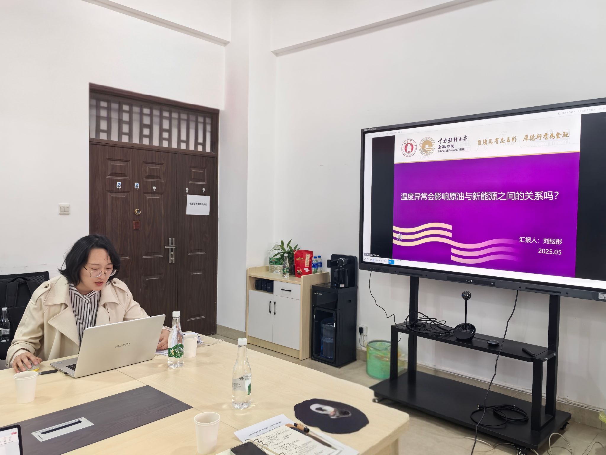 2025年5月23日,由学校科学技术处主办、金融学院承办的第七期“云彩”青年学者论坛在博远楼115会议室举行,本期论坛聚焦于“气候变化背景下风光资源波动风险及其管理初探”及“温度异常会影响原油与新能源之间的关系吗?”,由金融学院薛霖博士、刘纭彤博士分别进行汇报。论坛邀请了《金融研究》编辑部负责人唐滔博士、东南大学李守伟教授、中央财经大学池义春教授担任点评专家,金融学院院长周伟、科学技术处副处长金杰、金融学院副院长李云仙及全校40余名师生参加了本次论坛。
