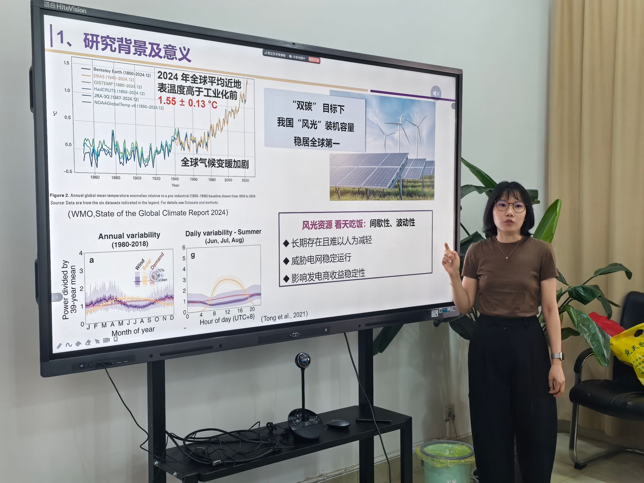 薛霖老师以“气候变化背景下风光资源波动风险及其管理初探”为主题,研究了在气候变化的背景下海上风电资源波动风险评估与管理和云南太阳能资源波动风险评估问题,研究为有效管理风光资源波动风险提供新思路。