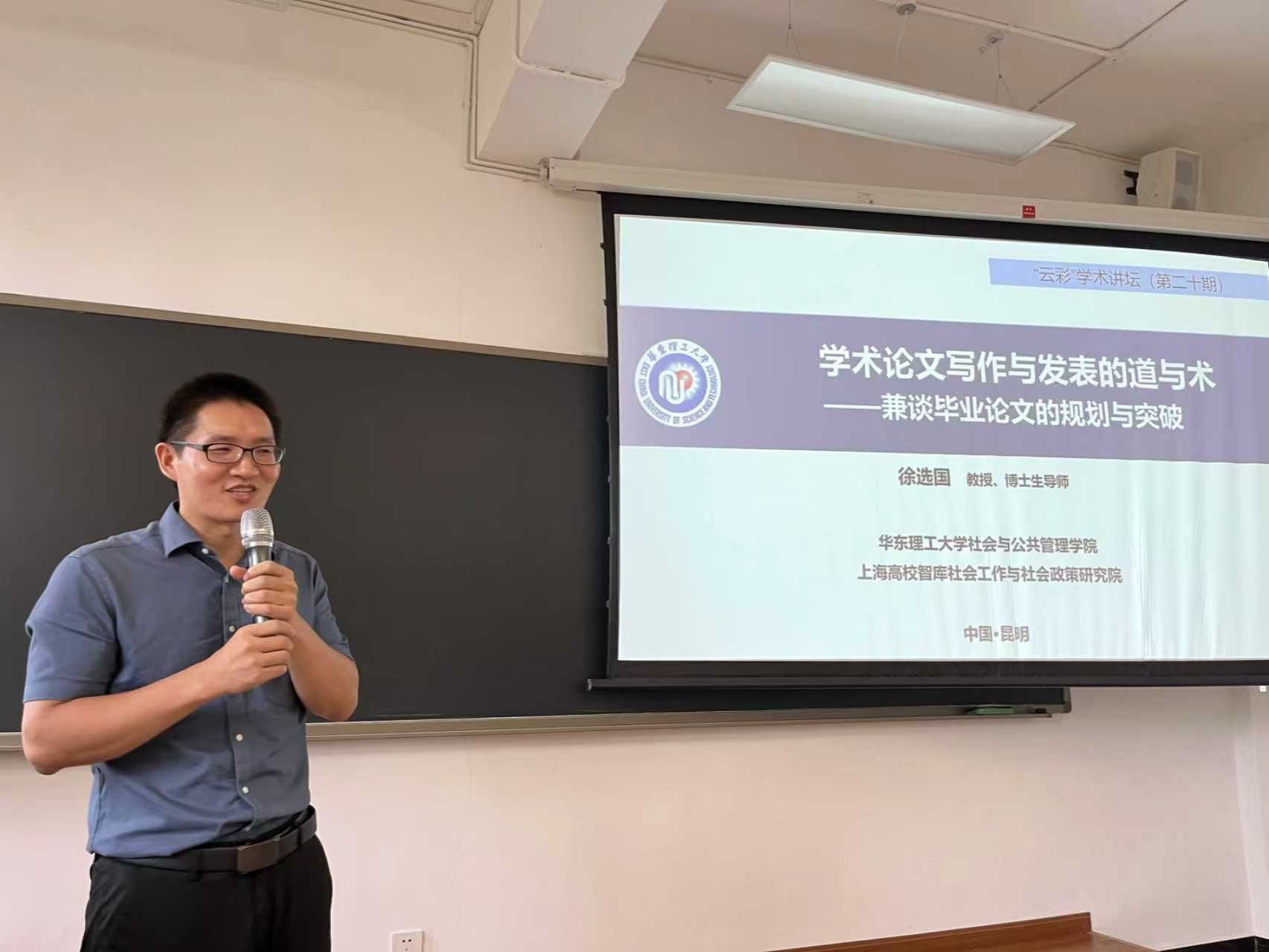 9月23日,学校举办第二十期“云彩”学术讲坛,邀请了华东理工大学社会与公共管理学院教授、博士生导师徐选国教授作题为《学术论文写作与发表的道与术——兼谈毕业论文的规划与突破》的专题讲座。讲座由法政学院社会工作硕士点负责人孙国嫄副教授主持,法政学院党委书记舒求及100余名师生到场聆听。