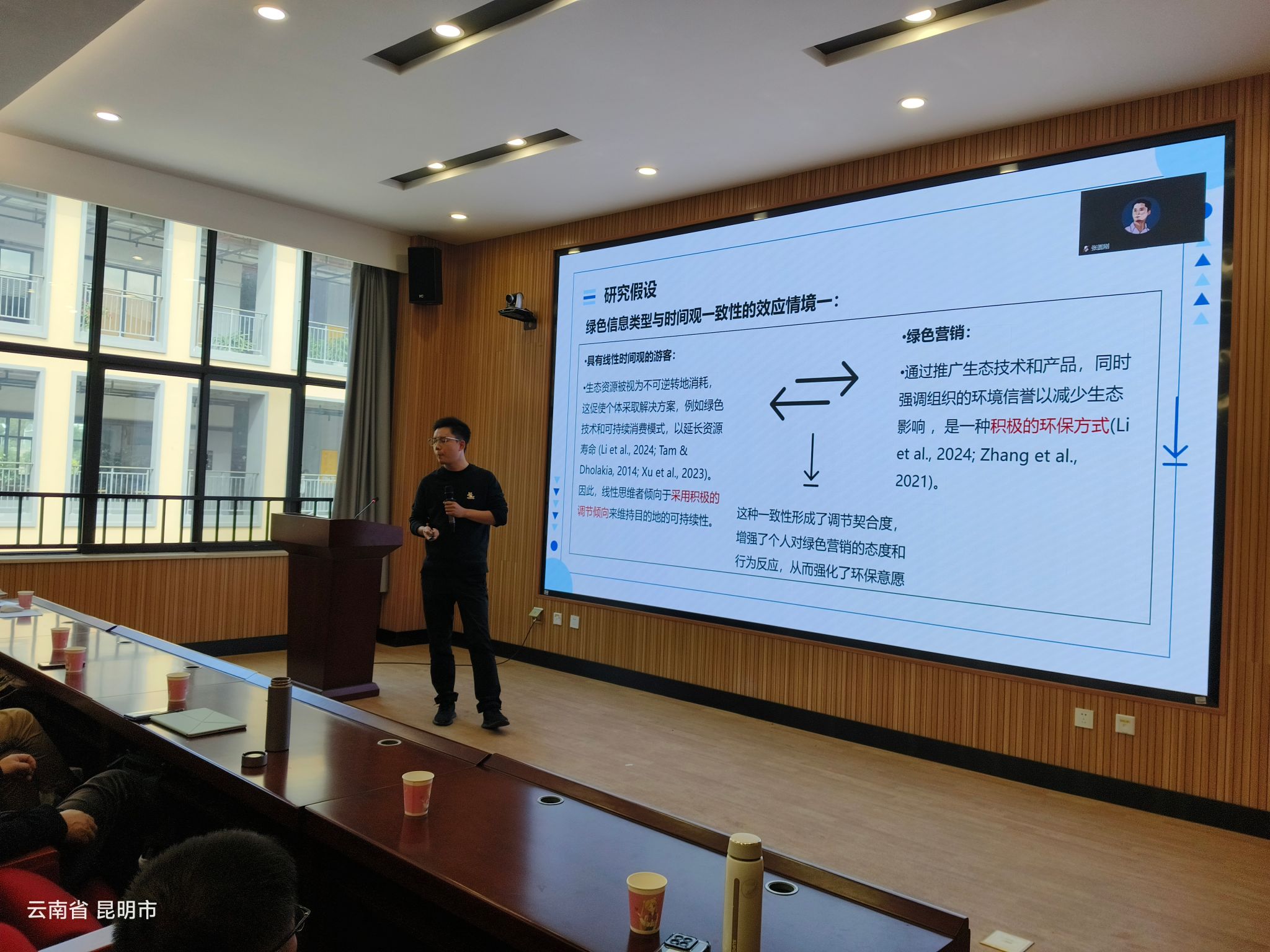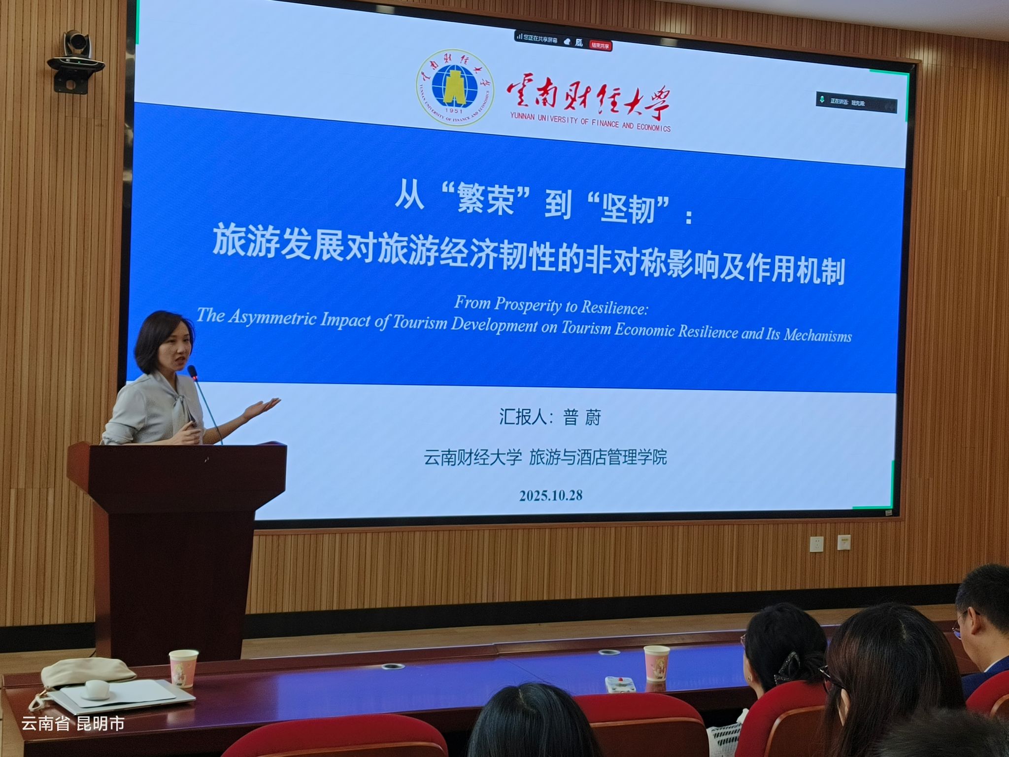 旅游与酒店管理学院韩剑磊副教授和普蔚副教授分别以“以销促绿还是以节促绿—绿色信息类型与时间观的匹配对游客亲环境行为的影响”和“从‘繁荣’到‘坚韧’:旅游发展对旅游经济韧性的非对称影响及作用机制”为主题进行了汇报,点评专家有针对性地提出了修改意见,与会师生积极参与,共同探讨,促进了学术交流,激发了创新思维。