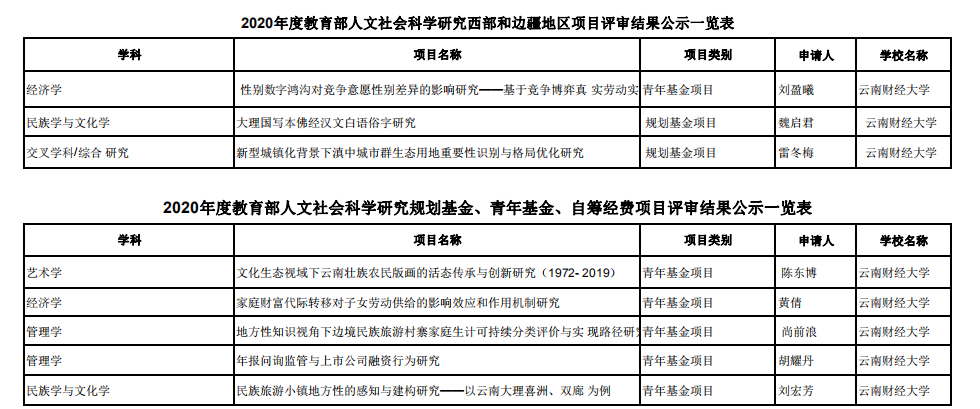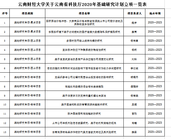 接《教育部社科司关于2020年度教育部人文社会科学研究一般项目评审结果的公示》和《云南省科技厅关于2020年省基础研究计划拟立项项目的公示》,买球共有21个项目获得立项资助。其中教育部人文社会科学研究一般项目立项8项:规划基金项目2项、青年基金项目6项;云南省科技厅基础研究计划立项13项:重点项目2项、面上项目4项、青年项目7项。