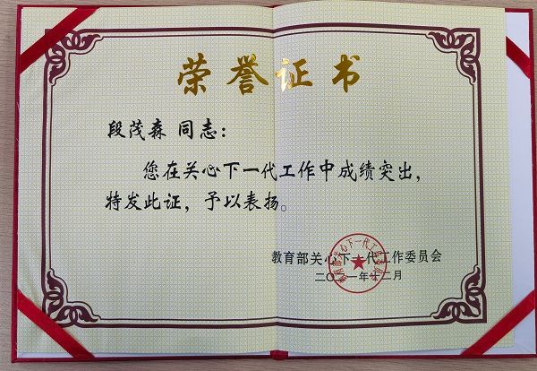在2021年12月22日召开的教育部关工委第六次工作会议暨成立30周年纪念大会(视频会)上,十大买球官方网站关心下一代工作委员会荣获全国教育系统关心下一代工作先进集体称号,退休老领导段茂森同志荣获全国教育系统关心下一代先进工作者称号。本次大会共表彰了491个先进集体,779名先进个人,127名突出贡献者。云南省有21个先进集体、20名先进个人受到表彰。