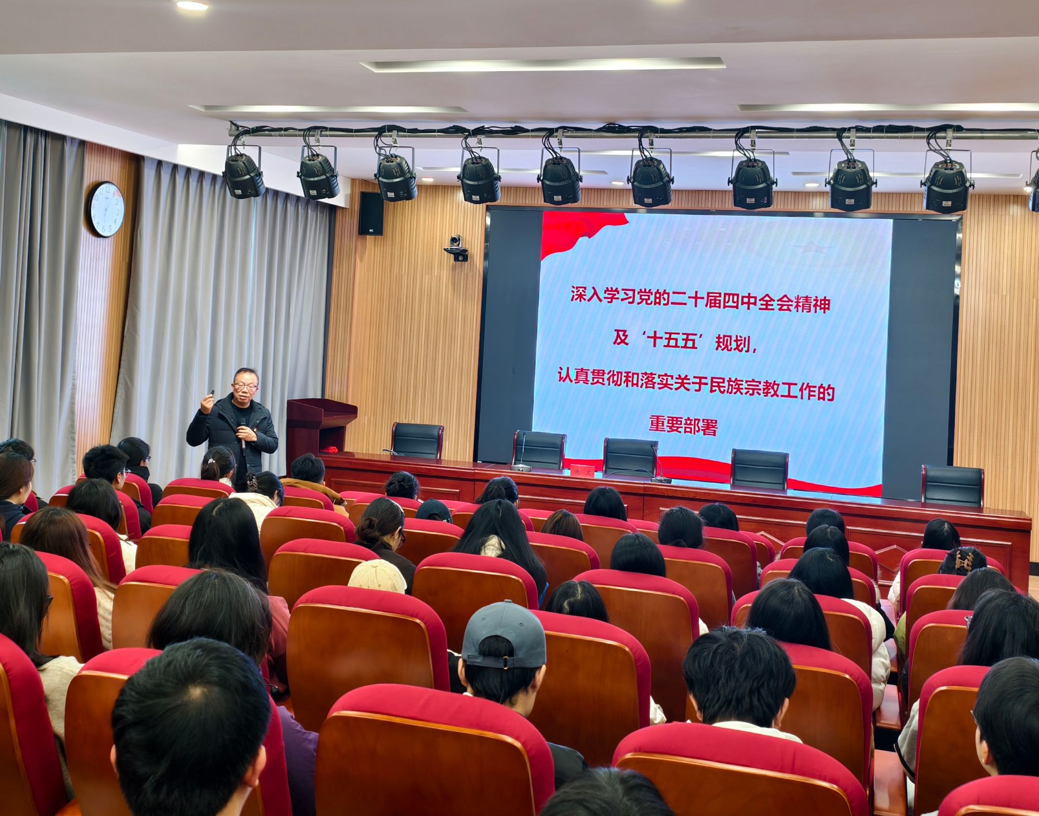 会后,朱文围绕“新时代民族宗教工作的历史方位”“铸牢中华民族共同体意识的时代内涵”“青年党员的担当路径”三个方面内容开展了“深入学习党的二十届四中全会精神”主题党课,旅游与酒店管理学院师生党员及入党积极分子80余人参加学习。