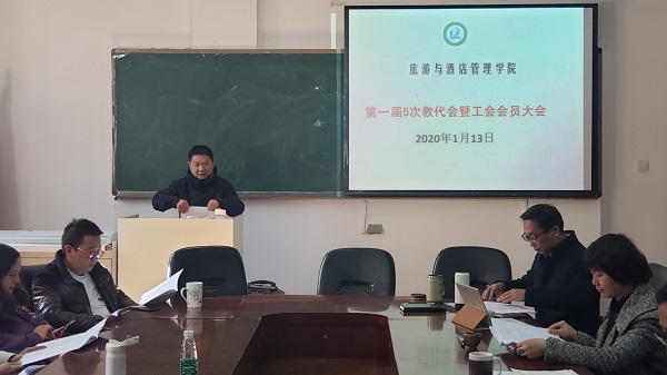 2020年1月13日下午,旅游与酒店管理学院召开一届5次教代会暨工会会员大会,学院全体教职工参加大会,大会由副院长谢洪忠主持。