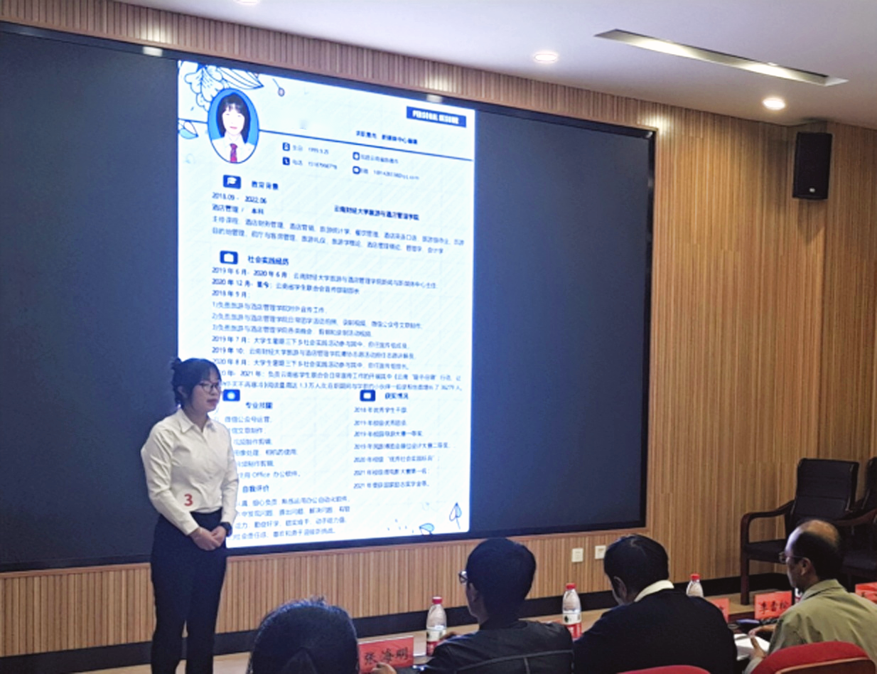 为了贯彻党中央、国务院、省委和省政府关于做好“六稳”、落实“六保”任务的决策部署,全力做好我院就业创业指导工作,加大就业服务工作力度,引导大学生了解用人单位需求,学院于2021年11月2日在齐远楼220报告厅举办了以“旅酒远航,逐梦青春”为主题的“铭鼎杯”大学生模拟求职大赛院级选拔赛暨旅游与酒店管理学院远航系列活动(二)。大赛由学院党委书记张向英、副书记李永祥、副院长李雪松、办公室主任王婧、辅导员谷彦霆、团委负责人张海明担任面试官。学院各班级推选的22名选手参加了本次学院选拔赛。