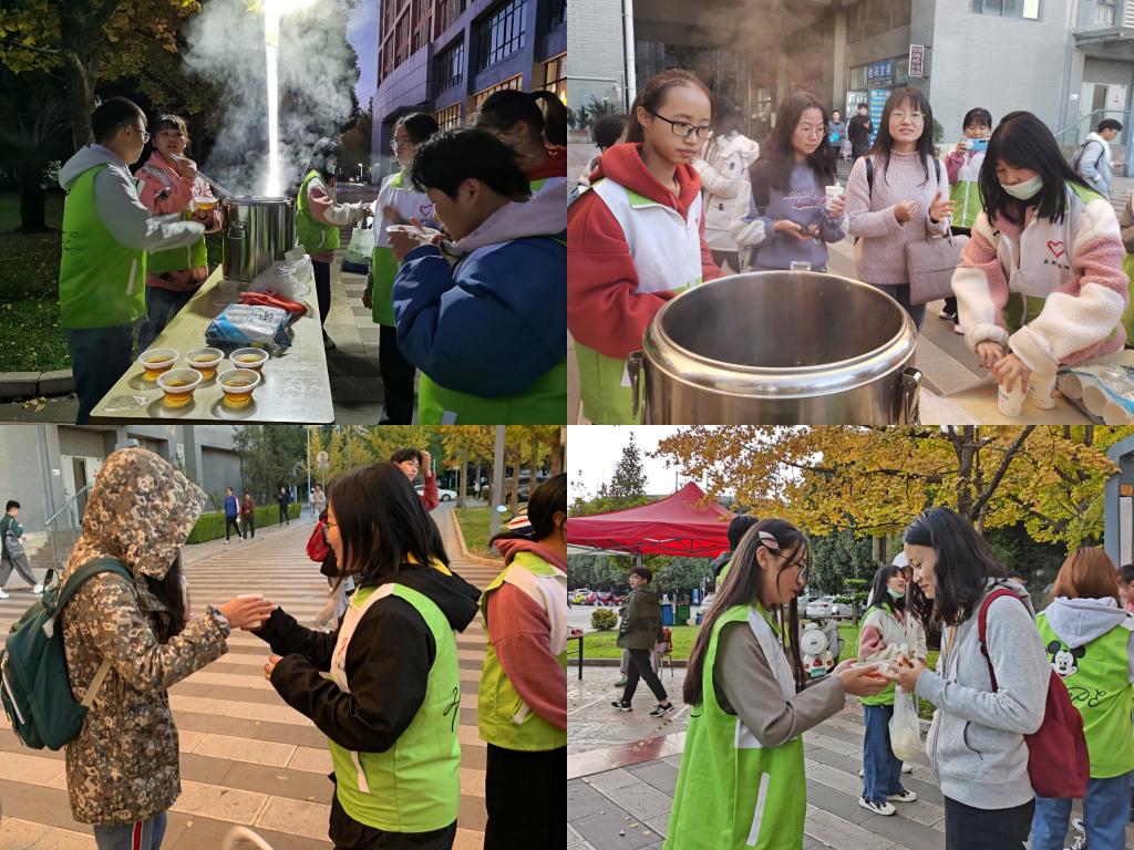 早晨6:50,30名志愿者在宿舍楼下集合完成签到,穿好志愿马甲后,立即前往英华餐厅配送姜汤。姜汤准备就绪,晨跑的同学、上早课的老师、早起工作的清洁阿姨等陆续出现;志愿者舀好姜汤后一一亲切递送,一碗碗冒着热气的姜汤、一次次耐心的询问,温暖了缩在袖子里冰冷的双手和被冷风吹得泛红的脸颊。