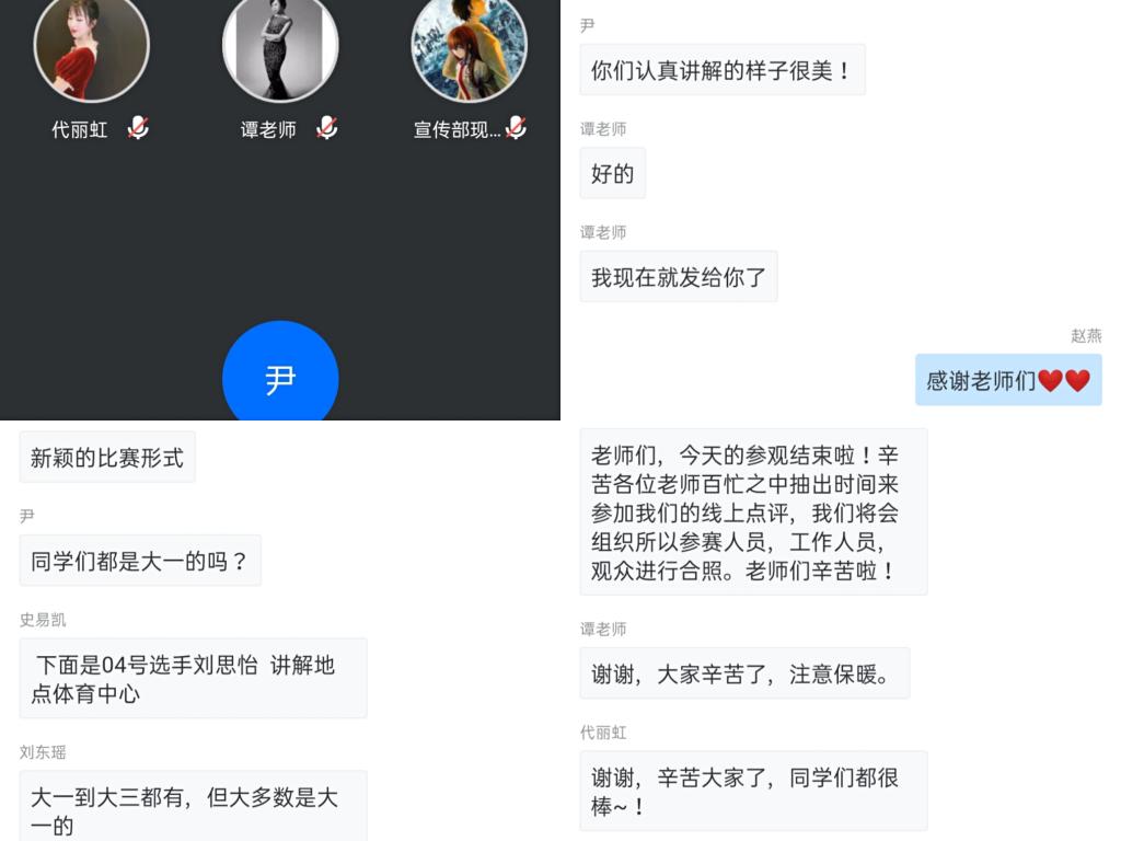 院旅游系专业教师尹戟、会展系专业教师谭庆莉和团委老师代丽虹担任专业评委,本次活动通过腾讯会议全程直播,将选手表现呈现给三位评委老师,由主席团成员、具有相关经验的导游证获得学生、志愿讲解队正式队员组成学生评委图全程跟随观赛评分,20名观众以及青协各部门的工作人员全程跟随观摩赛况。