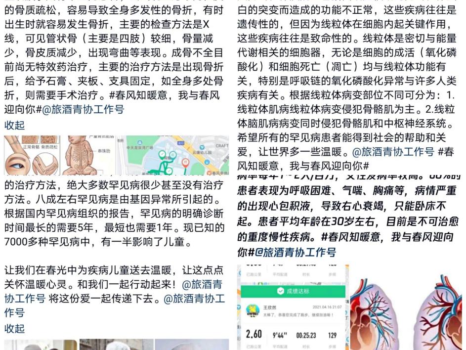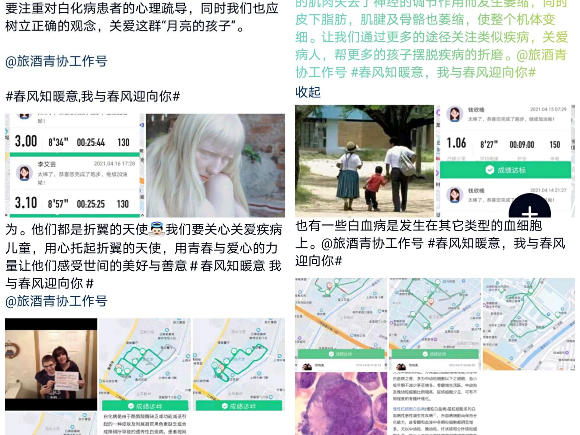 “阳春布德泽,万物生光辉”,为呼吁买球大学生关注儿童疾病,培养互助友爱意识,2021年4月14日至16日,旅游与酒店管理学院青年志愿者协会开展了“春风知暖意,我与春风吹向你”助力宣传儿童罕见病活动。该活动面向全校开展,持续三天,参与人数达300人次。