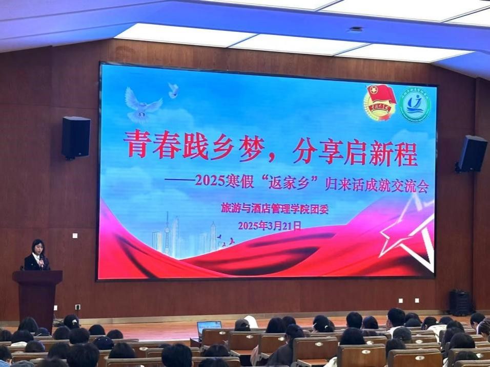 为深入学习宣传贯彻习近平总书记关于青年工作的重要思想,落实学校团委2025年“万企兴万村”专项调研行动要求,践行十大买球官方网站"三进一出"实践育人理念, 3月21日下午,旅游与酒店管理学院团委在鹏云一101、鹏云二306、308、309教室组织开展了以“青春践乡梦,分享启新程“为主题的“返家乡”归来话成就交流会。此次活动由团委组织部戴筱洋同学主持,唐榕、李玉珍和熊艳三位同学作为学院2025“返家乡”实践队队长担任主讲,2024级全体学生参与交流活动。