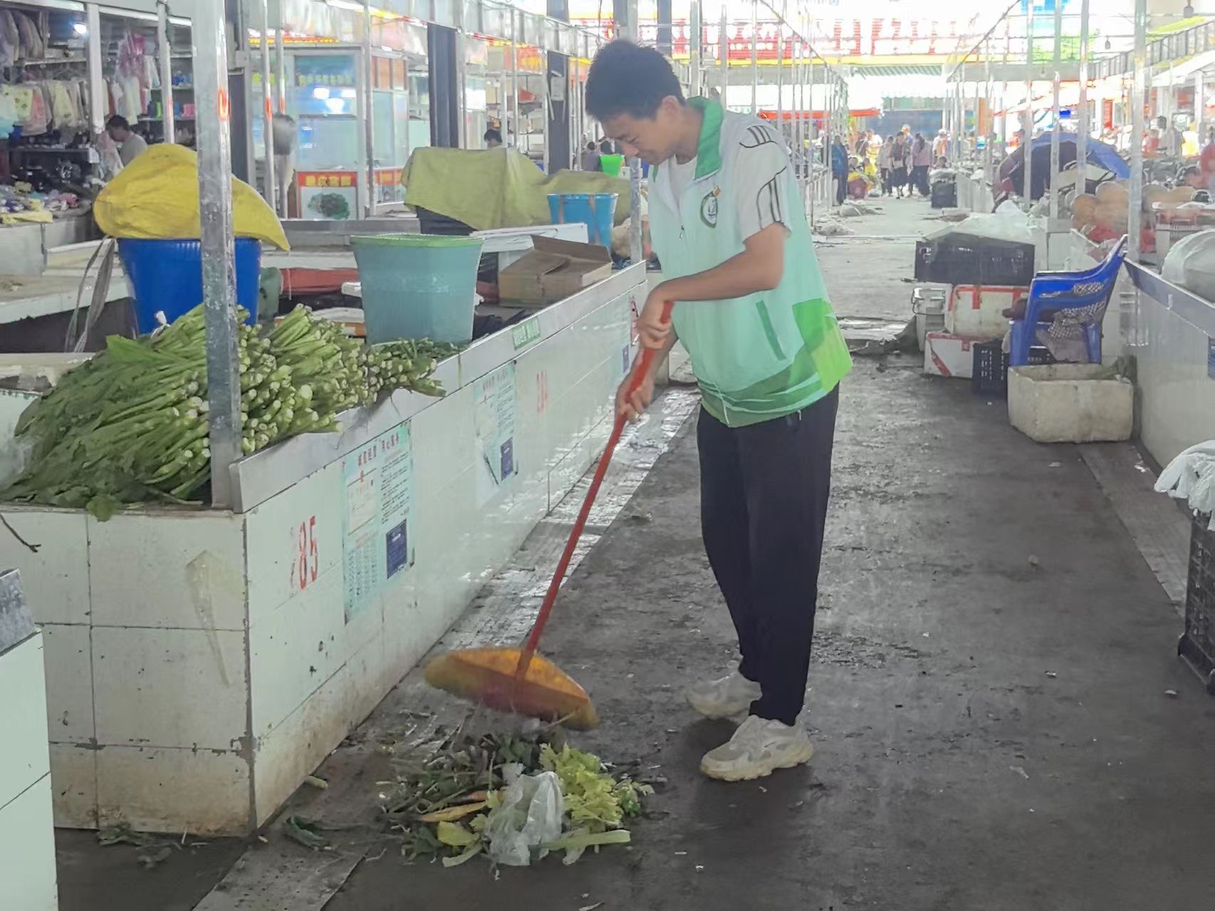 志愿服务团一行来到了骏城农贸市场,这里是乡村生活的重要组成部分,也是环境卫生整治的重点区域。志愿者们手持扫帚、垃圾袋等清洁工具,对市场的各个角落进行了清扫。同时还协助商户整理摊位,向商户宣传垃圾分类有关知识,增强商户和当地居民环保意识,保持市场环境整洁有序。