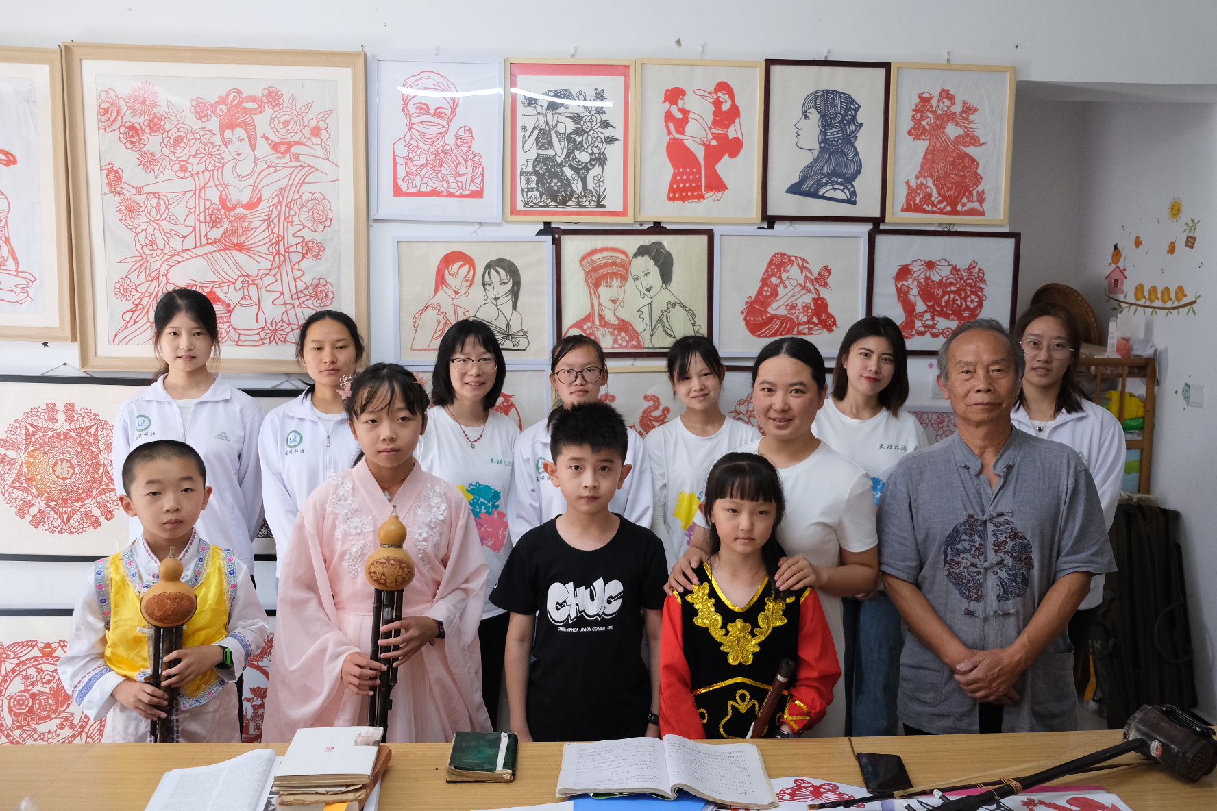 午后,黄占元老师带领实践队员们拿起剪刀,尝试剪纸并融入民族特色,队员们兴致勃勃,积极创作,更加近距离地感受到滇派剪纸的真实魅力。在黄老先生的二胡伴奏下,实践队员们吟唱了一曲《小河淌水》,民族音乐回荡在工作室里,脑海里已是一幅中华民族的繁荣场景。