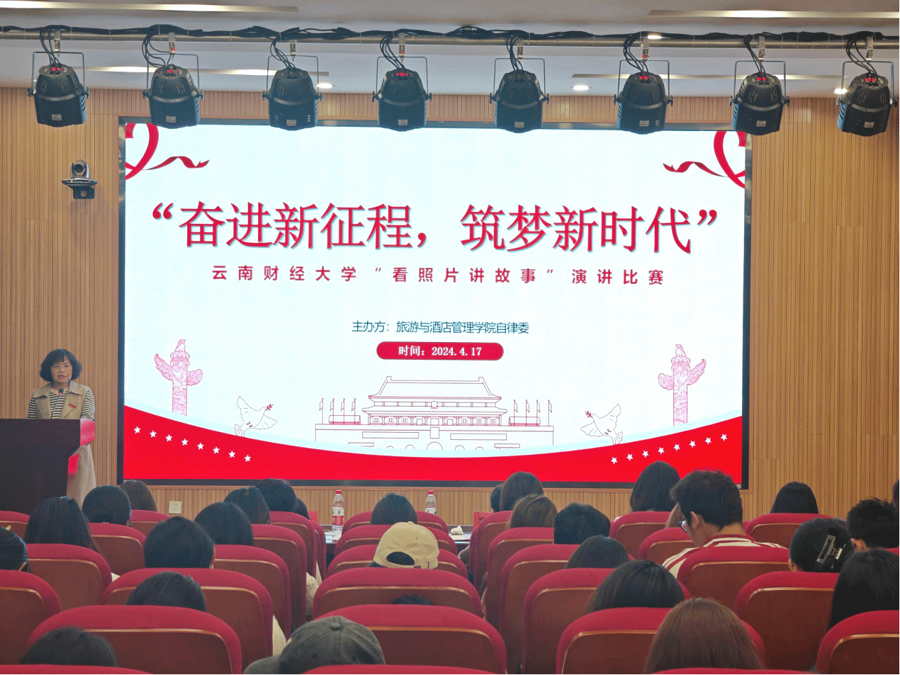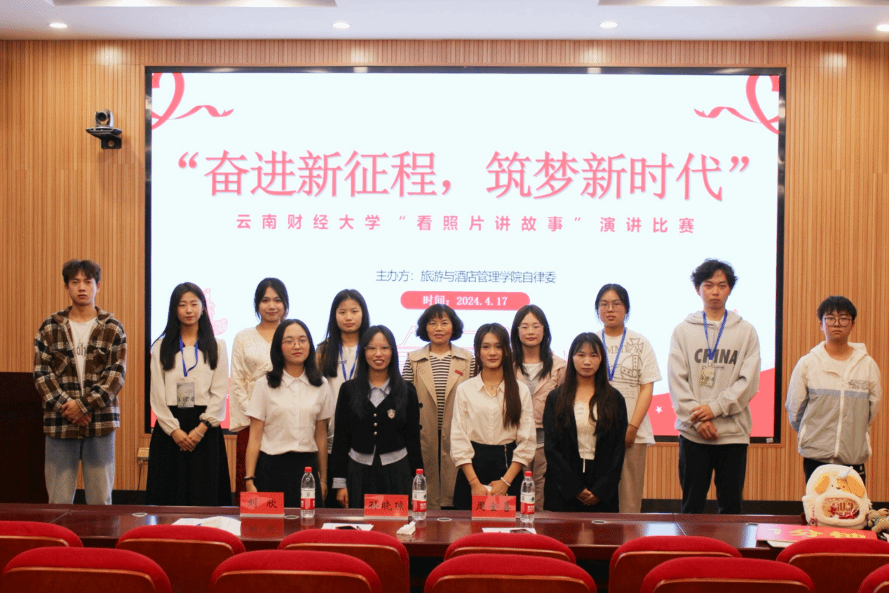 为深入学习贯彻习近平新时代中国特色社会主义思想,激励广大师生厚植爱党爱国爱社会主义情感,旅游与酒店管理学院于4月17日晚19时,在齐远楼220报告厅举办了“奋进新征程·筑梦新时代”看照片讲故事演讲比赛。学院学生科科长孙晓琼、学生科刘欣及自律委主席团成员周金喜担任评委,活动吸引60余名同学前来观摩,现场气氛热烈。