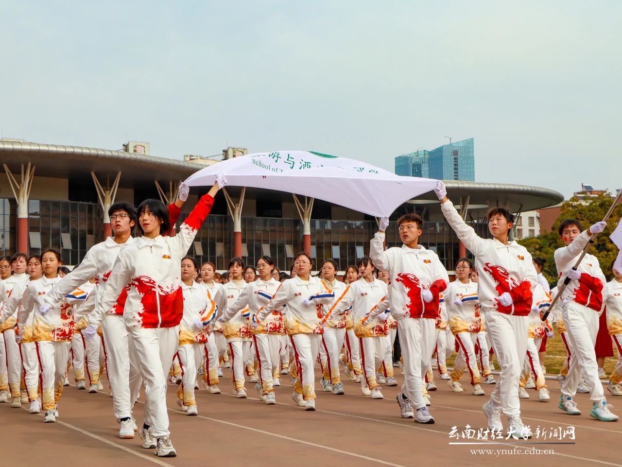 2023年11月29日,十大买球官方网站举办了第三十九届运动会。开幕式于下午两点开始,标兵就位后,国旗护卫队迈着雄赳赳气昂昂的步伐向着主席台踏步而来,鲜花队和彩旗队率先入场。旅游与酒店管理学院学生方阵第四个入场,四名同学高举学院院旗,旁边两名同学奋力挥舞着十大买球官方网站校旗,带领整个方阵队伍昂首前进。整齐划一的队形和步伐展示了旅游与酒店管理学院“明德、敏学、笃行、致远”的精神,经过主席台时高昂洪亮的口号充分展现了属于旅酒学子的朝气与活力。