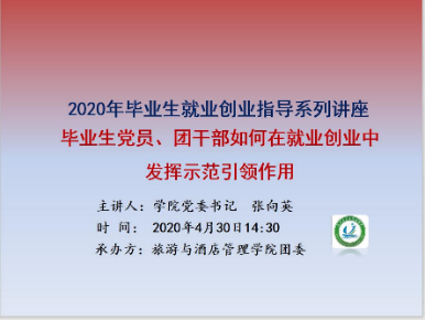 2020年4月30日14点30,旅游与酒店管理学院于线上举行毕业生就业创业指导系列讲座之毕业生党员、学生骨干如何在就业创业中发挥示范引领作用主题讲座。本次讲座由学院党委书记张向英主讲,学院团委负责人杨倩主持。学院各学生支部党员、预备党员、学生骨干等200余名学生及部分班主任参与讲座。