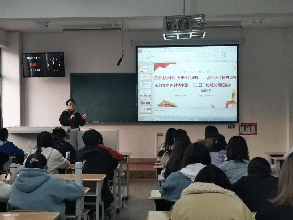 2020年11月10日18:00,旅游与酒店管理学院开展2020年“争先锋、创一流”万名党员进党校活动暨发展党员集中培训第八课在北院卓媒624教室举行,学院党委委员、办公室主任王婧以《历史性的跨越,决定性的成就—以习近平同志为核心的党中央引领中国“十三五”时期发展纪实》为主题参加党课的党员、积极分子们进行了讲授。