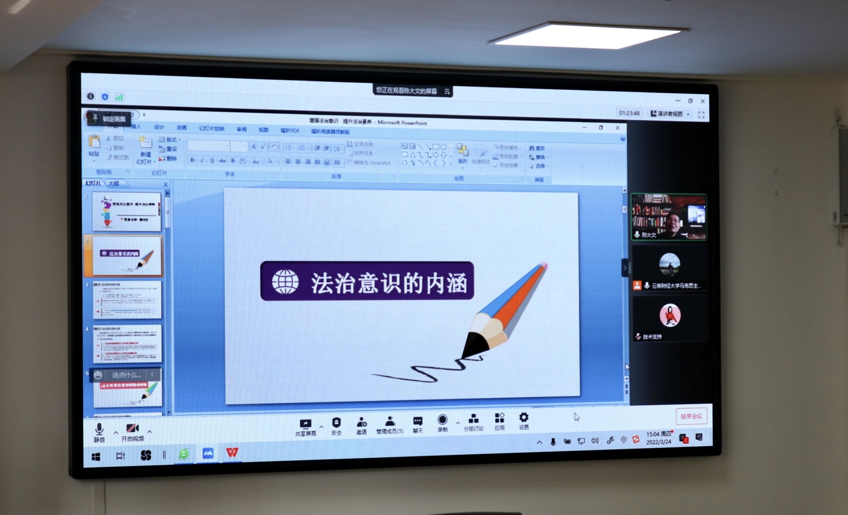 3月24日下午,2022年云南省高校“思想道德与法治”课集体备课会在买球举行。国家教学名师、同济大学长聘教授、马克思主义学院博士生导师、教育部“思想道德与法治”分教学指导委员会副主任委员陈大文教授,受邀以线上形式为全省高校思政课教师作《增强法治意识 提升法治素养》专题辅导。马克思主义学院常务副院长宁乐锋教授主持。