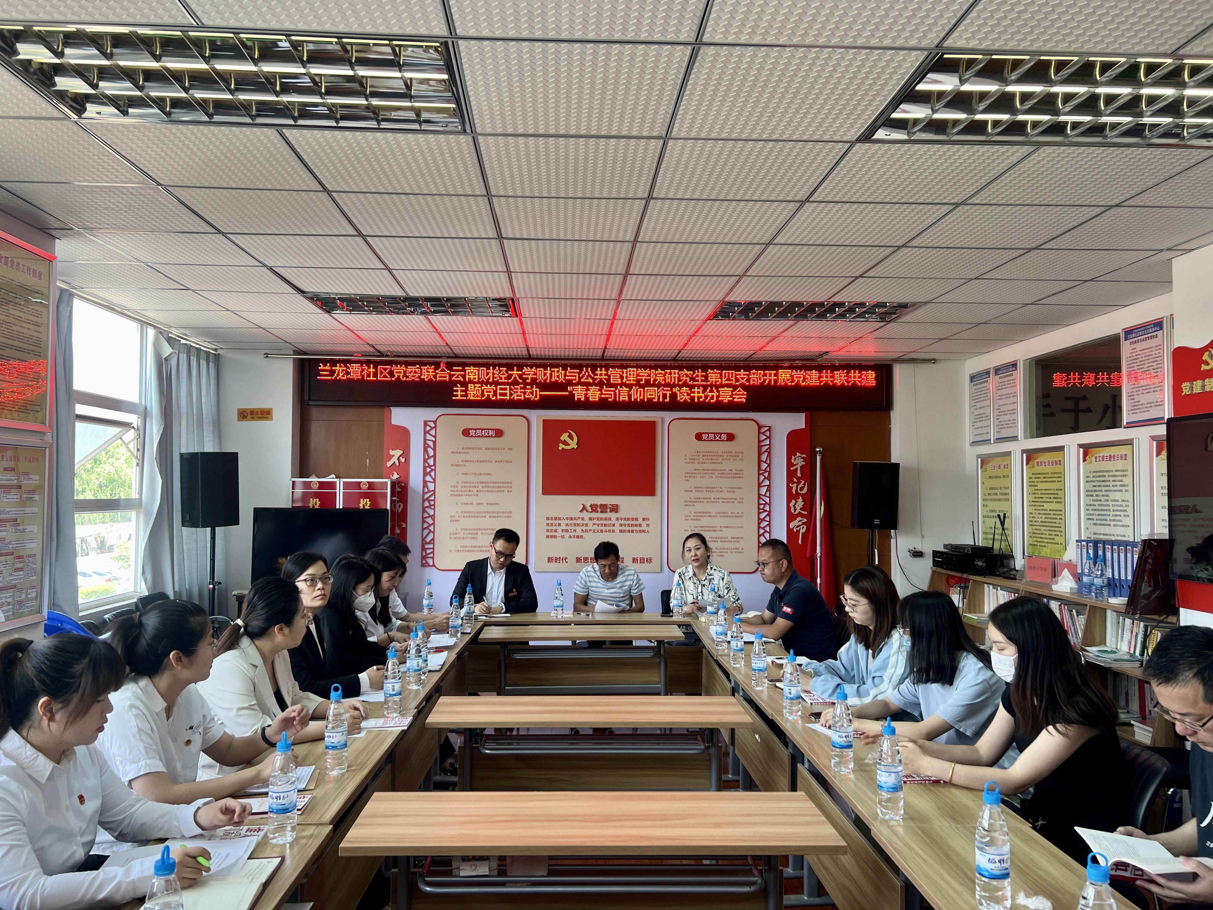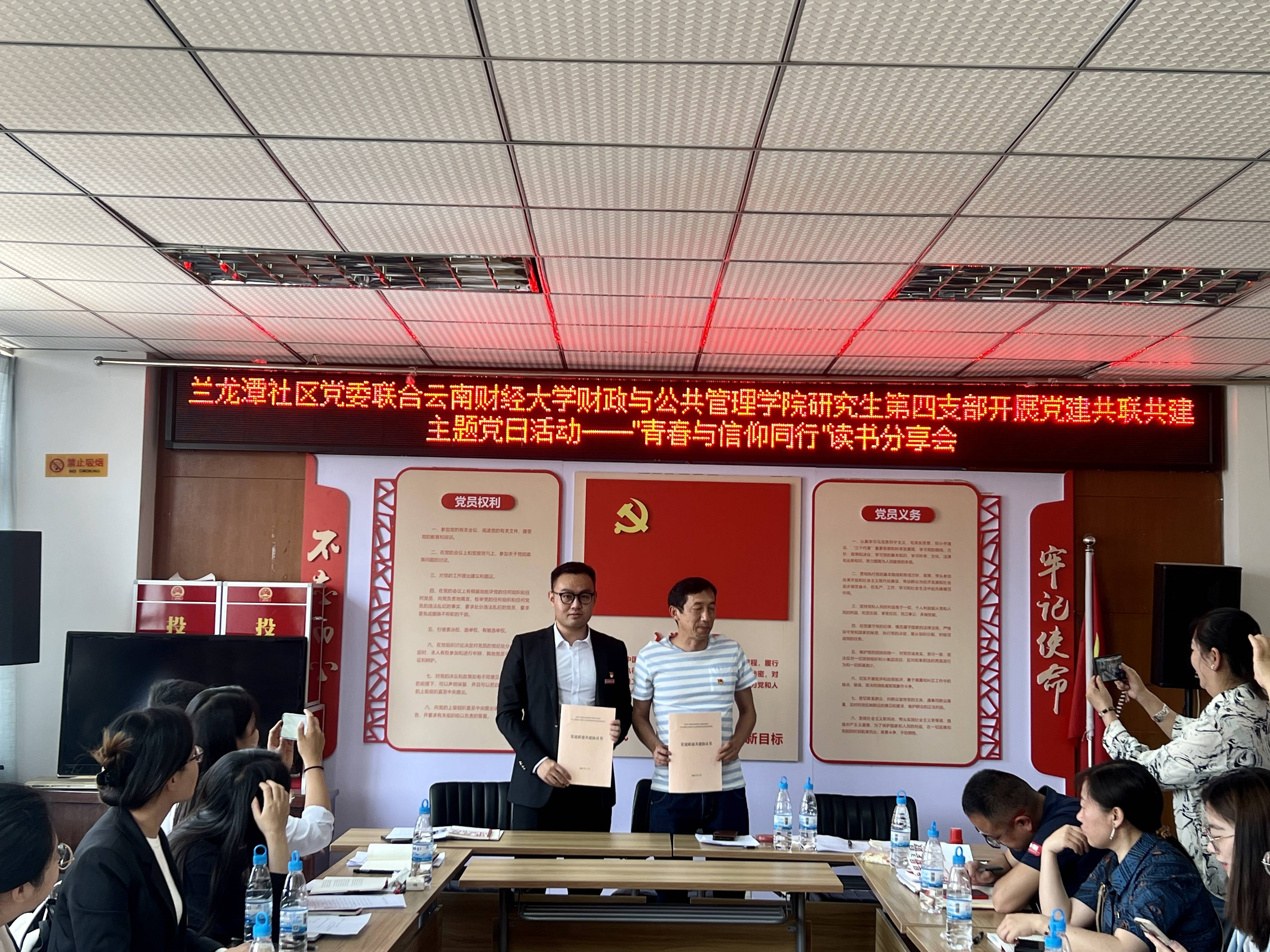 为深入学习贯彻党的二十大精神,坚持以习近平新时代中国特色社会主义思想为指导,落实新时代党的建设总要求,充分发挥党组织的政治功能、组织功能, 4月19日,财政与公共管理学院研究生第四党支部联合兰龙潭社区党委开展“党建联建共建”签约仪式暨《谁是最可爱的人》读书分享会主题党日活动。会议由兰龙潭社区党委组织委员于雁主持,学院研究生第四党支部党员、兰龙潭社区党委所属18个党支部书记参加了会议。