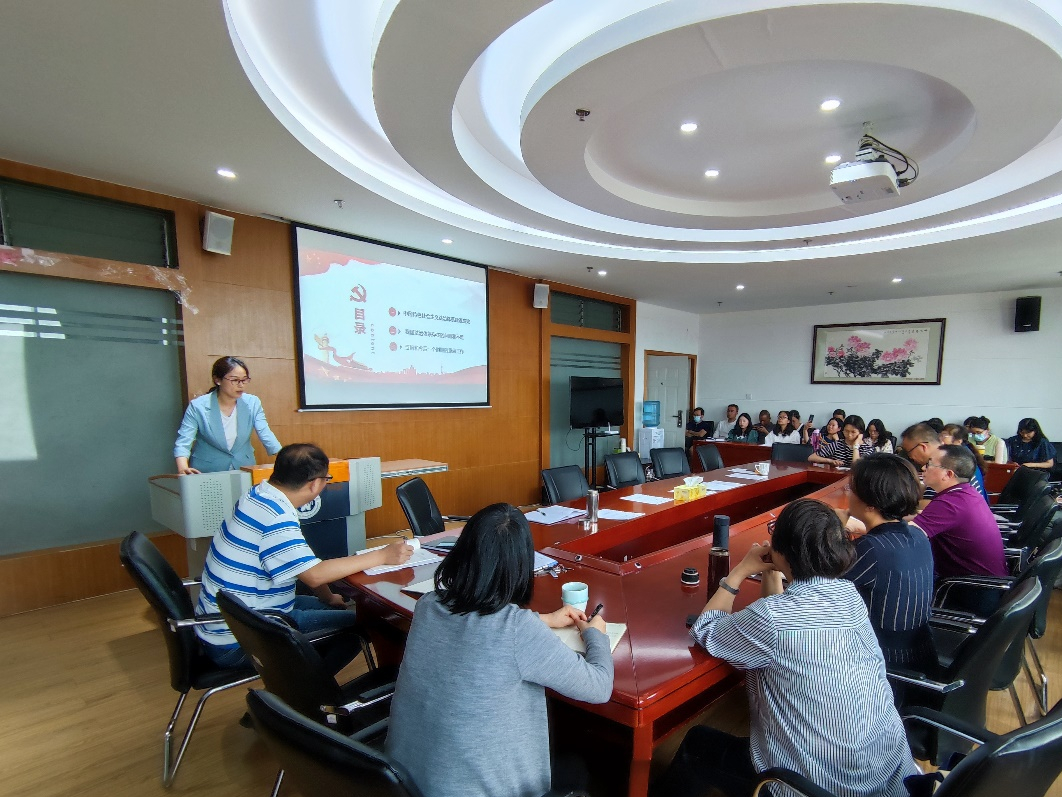 学院党委副书记兼纪委书记王晓芬传达学习了习近平总书记在十九届中共中央政治局第三十五次集体学习时的讲话——《坚持走中国特色社会主义法治道路 更好推进中国特色社会主义法制体系建设》。她从中国特色社会主义法治体系建设成就、我国法治体系存在的问题和不足、当前和今后一个时期的重点工作三个方面进行了领学。
