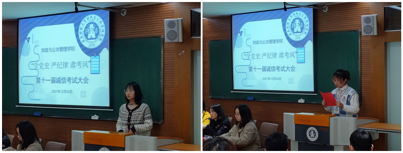12月24日,财政与公共管理学院于南院逸夫楼706教室召开“学党史 严纪律 肃考风”第十一届诚信考试大会,财政与公共管理学院副院长韩全芳、党委副书记王晓芬,学院辅导员、组织员及学生骨干、学生党员、各班学生代表参会,会议由学院学生管理科科长兼团委书记饶篁主持。