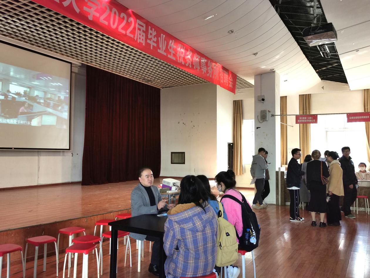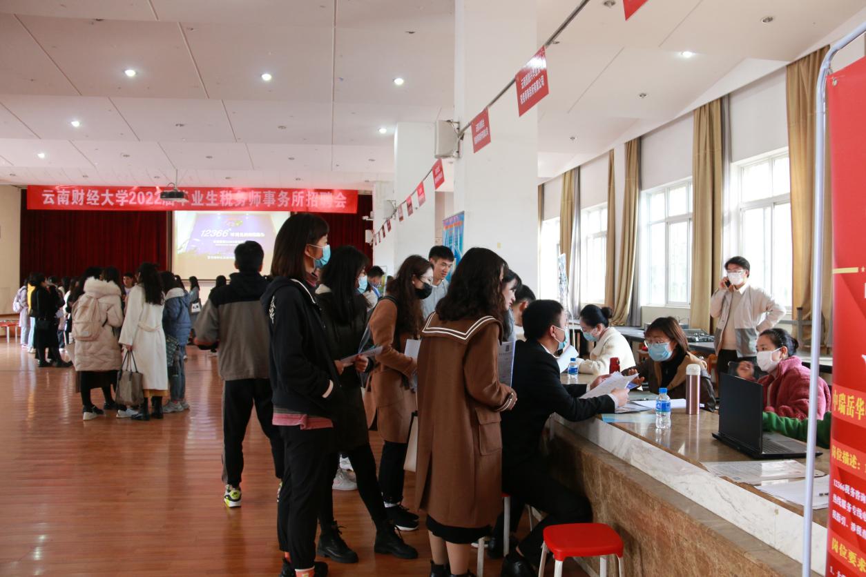 本次招聘会由云南省注册税务师协会、云南省注册税务师行业党委,与买球财政与公共管理学院、会计学院及经济学院联合主办。云南省注册税务师协会秘书长杨银波、副会长熊斌,财政与公共管理学院党委副书记王晓芬、会计学院党委副书记王涛到招聘会现场了解毕业生应聘情况,并与同学们进行深入交流。