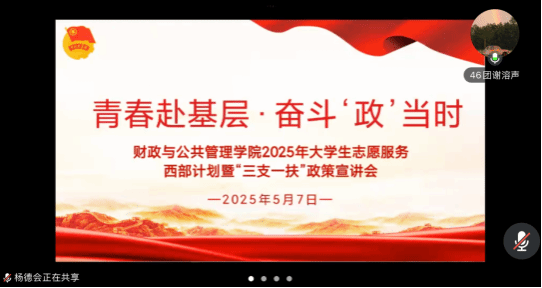 5月7日,财政与公共管理学院开展“青春赴基层·奋斗‘政’当时”——2025年大学生志愿服务西部计划暨“三支一扶”政策宣讲会。学院党委副书记李昀璟,2019届公共事业管理专业毕业生谢溶声、2024届行政管理专业毕业生李梦娇以及2025届毕业生代表参加会议,学院团委负责人杨德会主持会议。