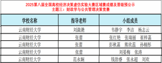 在刚刚结束的2025年第八届全国高校经济决策虚仿实验大赛区域赛中,买球财政与公共管理学院首次参赛,有5支团队晋级区域赛。刘潋滟老师指导,韦静宇、李洁、杨志云组成的团队,荣获区域赛三等奖,张蕾老师指导的3支团队及范永娴老师指导的1支团队荣获优胜奖,全面展示了学院实践教学和人才培养的系统化成果。