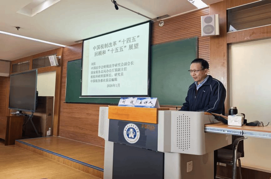 2026年1月14日下午,财政与公共管理学院政管论坛——名家讲座在南院逸夫楼706举行。中国法学会财税法学研究会副会长、中国税务报社总编辑、中国财政学会、中国税务学会和中国国际税收研究会常务理事刘佐老师做题为“中国税制改革‘十四五’回顾和‘十五五’展望”的学术报告,讲座由学院副院长和立道教授主持,部分教师及研究生共同参与了此次学术交流活动。
