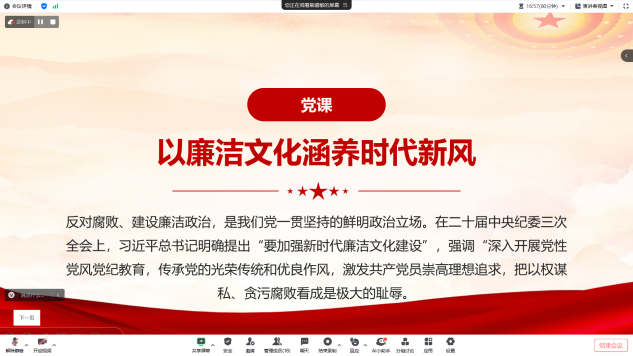 葛译遥同志围绕廉洁文化的内涵、意义及如何在工作中践行廉洁文化等方面进行了深入浅出的讲解,并结合实际案例,引导党员们加强自身修养,增强廉洁意识,共同营造风清气正的环境。