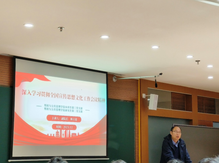 2023年12月11日,财政与公共管理学院研究生第二党支部和本科生第三党支部在逸夫楼707开展主题为“深入学习贯彻全国宣传思想文化工作会议精神”的党课学习活动,研究生第二党支部和本科生第三党支部的全体同志参加了本次学习。