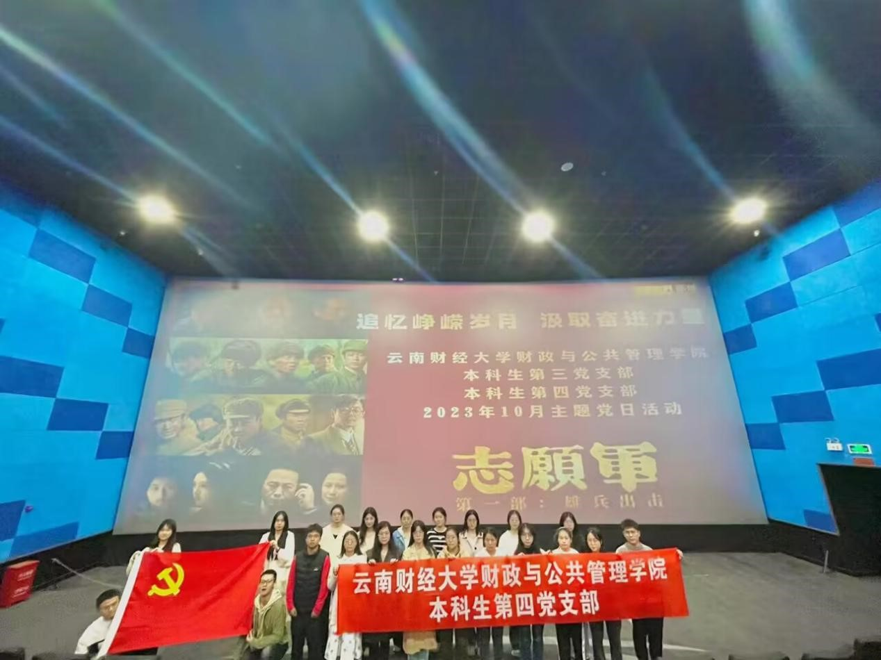 2023年10月13日,财政与公共管理学院本科生第四党支部在昆明市完美世界影城开展10月主题团日活动。支部全体党员同志参加了本次会议,会议由支部组织委员孟丽华主持。