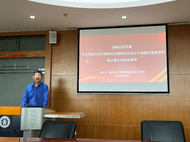 2023年6月26日,财政与公共管理学院研究生第一党支部与本科生第二党支部在逸夫楼923联合举办“深刻认识开展学习贯彻习近平新时代中国特色社会主义思想主题教育的重大意义和目标要求”的专题党课,本次党课由学院党委委员韩全芳主讲。