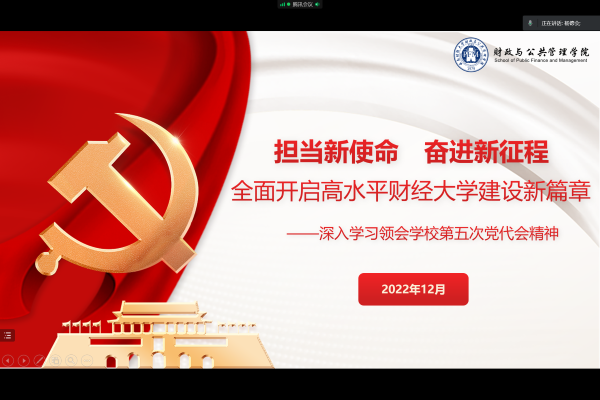 2022年12月8日,财政与公共管理学院本科生第三党支部在线上组织召开学习领会学校第五次党代会精神的支部党员大会,会议由支部书记杨德会同志主持。