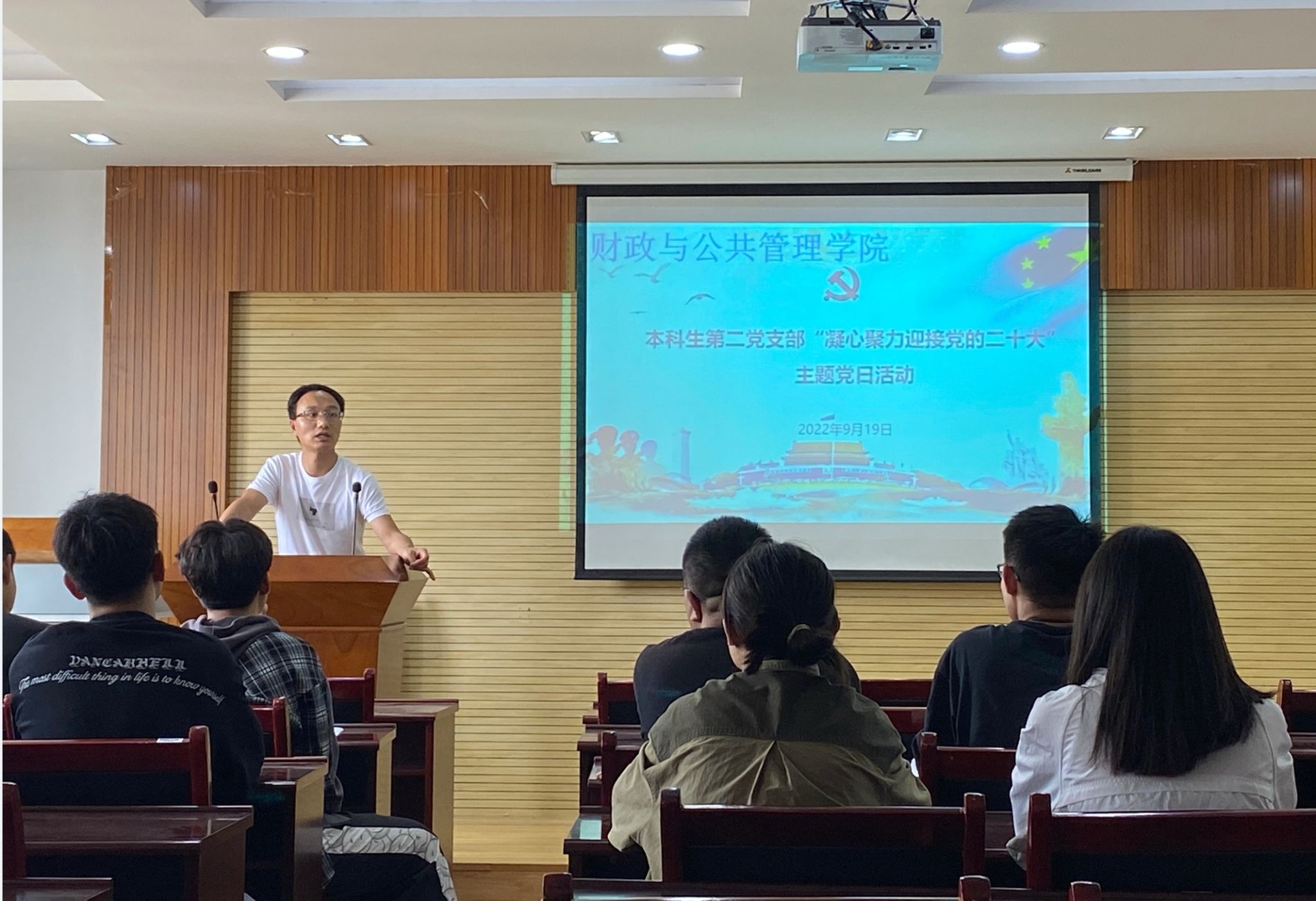 2022年9月19日,财政与公共管理学院本科生第二党支部在逸夫楼603会议室召开九月份主题党日活动,本次党日活动主题为“凝心聚力迎接党的二十大”,本次活动由党支部书记李宁同志主讲,本科生第二党支部同志积极参与学习。
