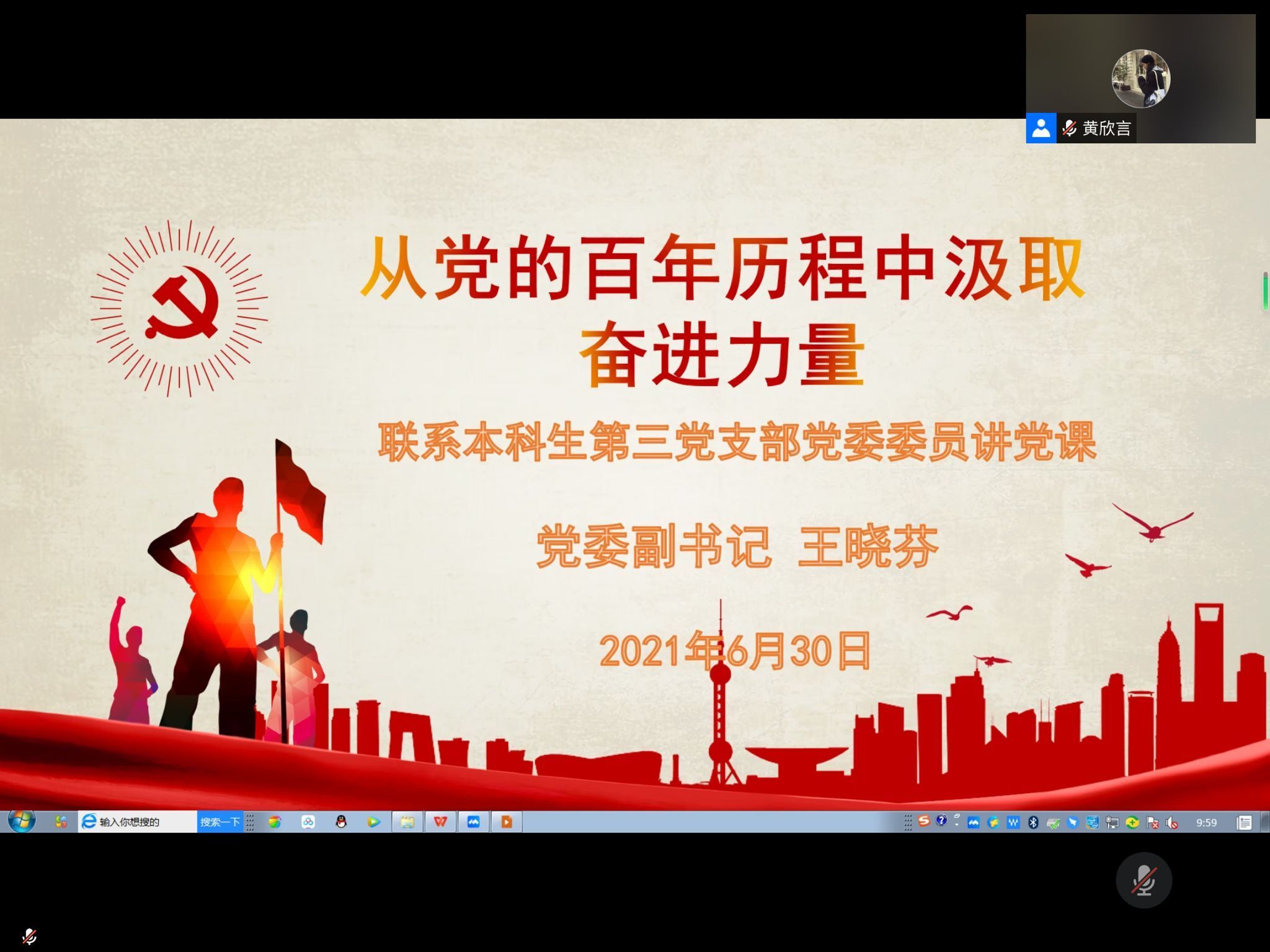 2021年6月30日,财政与公共管理学院本科生第三党支部组织党员同志在腾讯会议上开展党课学习。党委副书记、党委委员王晓芬同志围绕“从党的百年历程中汲取奋进力量”的主题,结合党史和习近平总书记关于党史学习的重要讲话,为党员同志带来了一堂生动纷呈的党课。