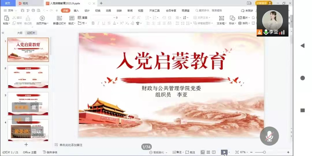 为加强2021级新生对党组织的了解,掌握入党要求和入党流程,提高新生的入党积极性,9月17日晚上8点,财政与公共管理学院学生党建工作事务中心举办2021级新生入党启蒙教育线上腾讯会议。本次会议由学院组织员李亚老师主讲。