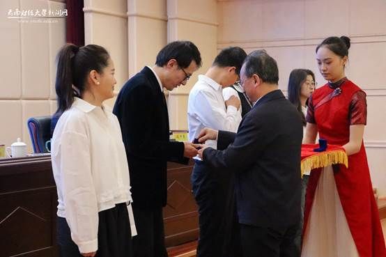 开班典礼上,陈红为新进教职工代表赠送校徽、校标。庞春平作培训工作安排、进行培训纪律教育,并组织全体新进教职工开展入职宣誓。