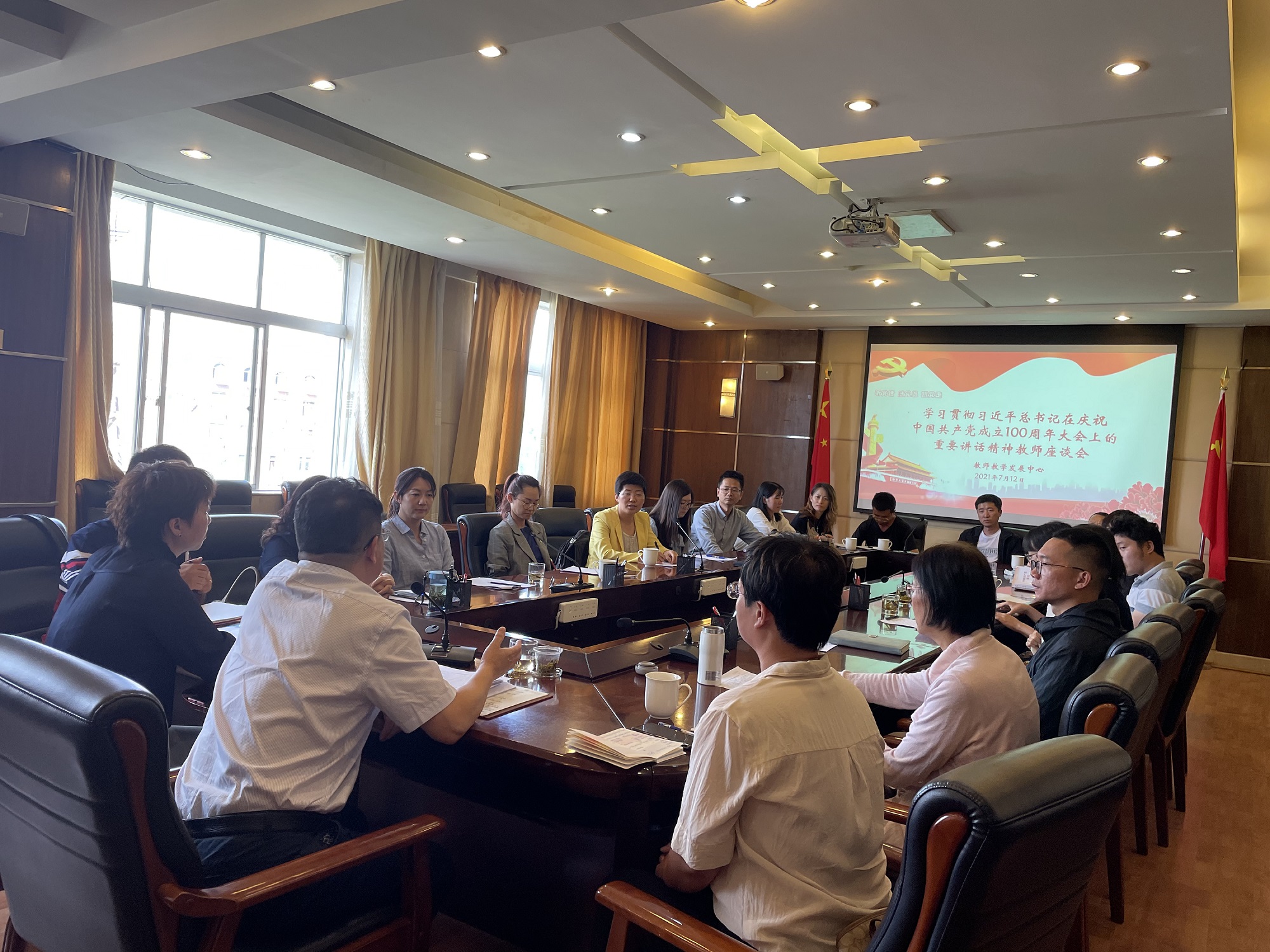 7月12日下午3时,十大买球官方网站教师教学发展中心在致远楼506会议室组织召开教师座谈会,深入学习贯彻习近平总书记在中国共产党成立100周年大会上的重要讲话精神。校党委副书记谢昌浩主持会议并领学,19家教学单位和科研院所(中心)党委各选派一线教师代表就学习习近平总书记重要讲话精神交流心得体会。