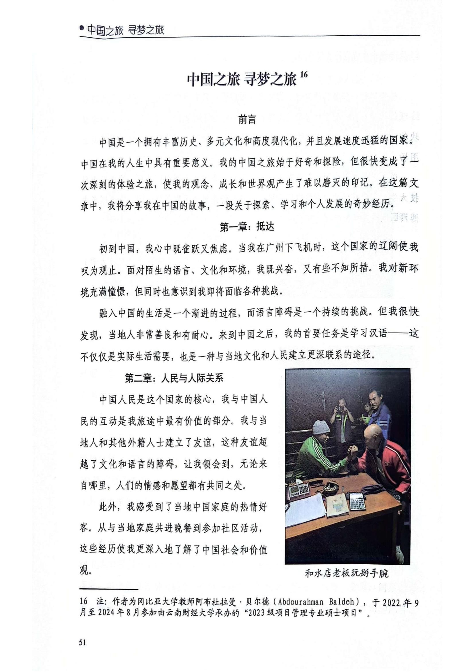 ABDOURAHMAN BALDEH(中文名:阿布杜拉曼 贝尔德)为冈比亚大学教师。他在文中分享在中国的人际关系、文化融入、城市探索及未来展望等方面感受。“仅仅参观历史遗址,或在远处观察传统并不足够;我想要更深入地参与和亲近当地文化。”他积极参与中国本土活动,增强跨文化交流能力。在社区组织中做志愿者的经历加深他对中国的认知。“这种融入使我能够获得第一手体验,了解当地日常生活 、家庭关系以及代代相传的传统文化。从庆祝中国新年到学习烹饪传统菜肴,这些经历让我以一种独特而亲近的方式来了解中国文化。”鉴于职业的特殊性,他表示“中国的教育体系以其严格性和学术性闻名。在中国期间,我有机会在当地大学学习课程,这是一次非常具有启发性的经历。”
