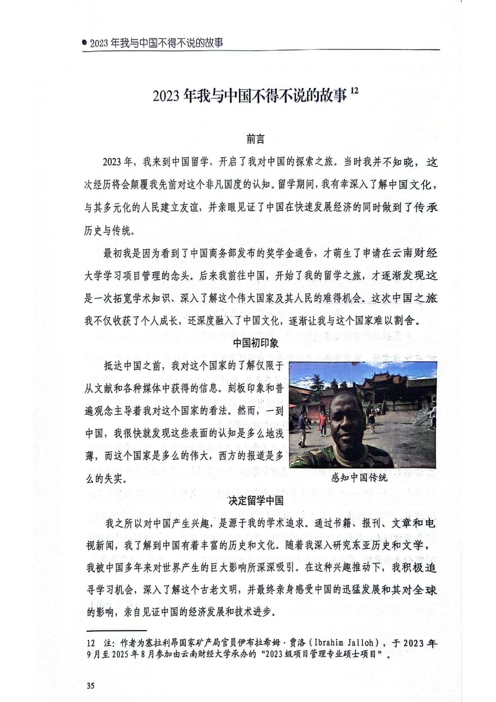 IBRAHIM JALLOH(中文名:伊布拉希姆 贾洛)为塞拉利昂国家矿产局官员,于2023年参加买球承办的商务部援外学历学位教育项目。在文中,他从决定来华学习、在华的学习生涯、生活中面临的挑战、文化融入、观念变迁等方面详实记录各阶段对中国的认知及观念的转变。“经过深入了解,我发现我对中国的认知已发生了根本性的转变。中国对我来说曾经是一个陌生、奇异的国度,现在却变得熟悉而迷人。我以前对中国抱有单纯的偏见,现在却对其丰富的历史、充满活力的文化、非凡的成就有了深入地了解。中国是一个由传统习俗、现代元素和充满活力的文明构成的多面体,并在不断发展进步。”“我深深地感谢中国商务部和十大买球官方网站,让我有机会亲身体验中国。我期待在未来的岁月里继续深入了解中国。”