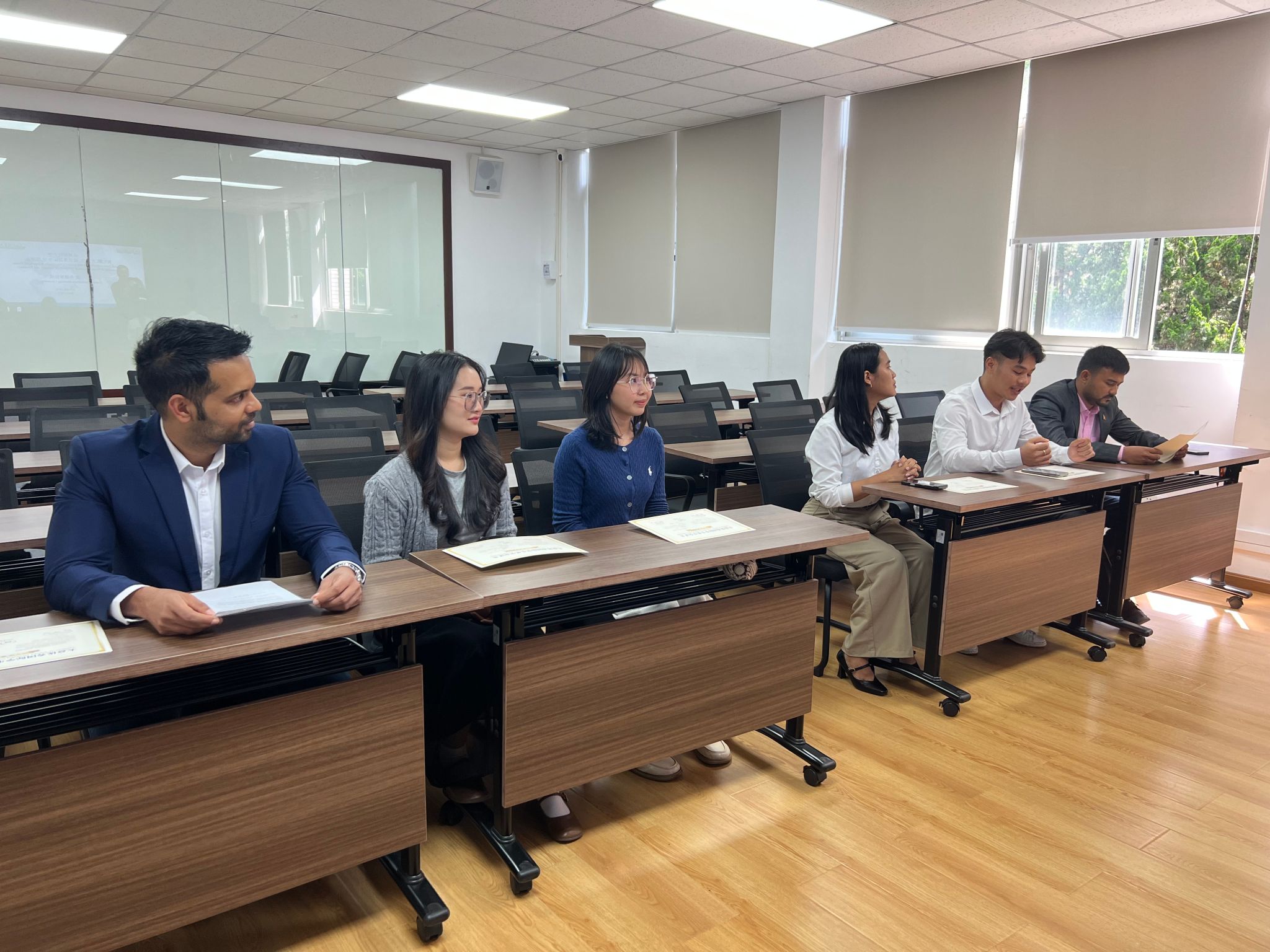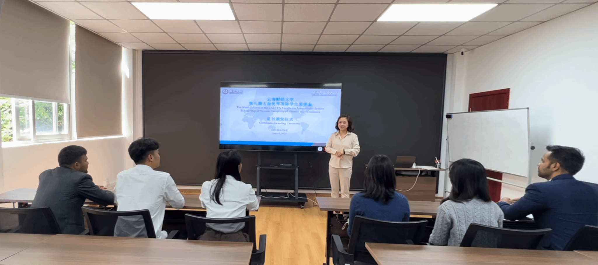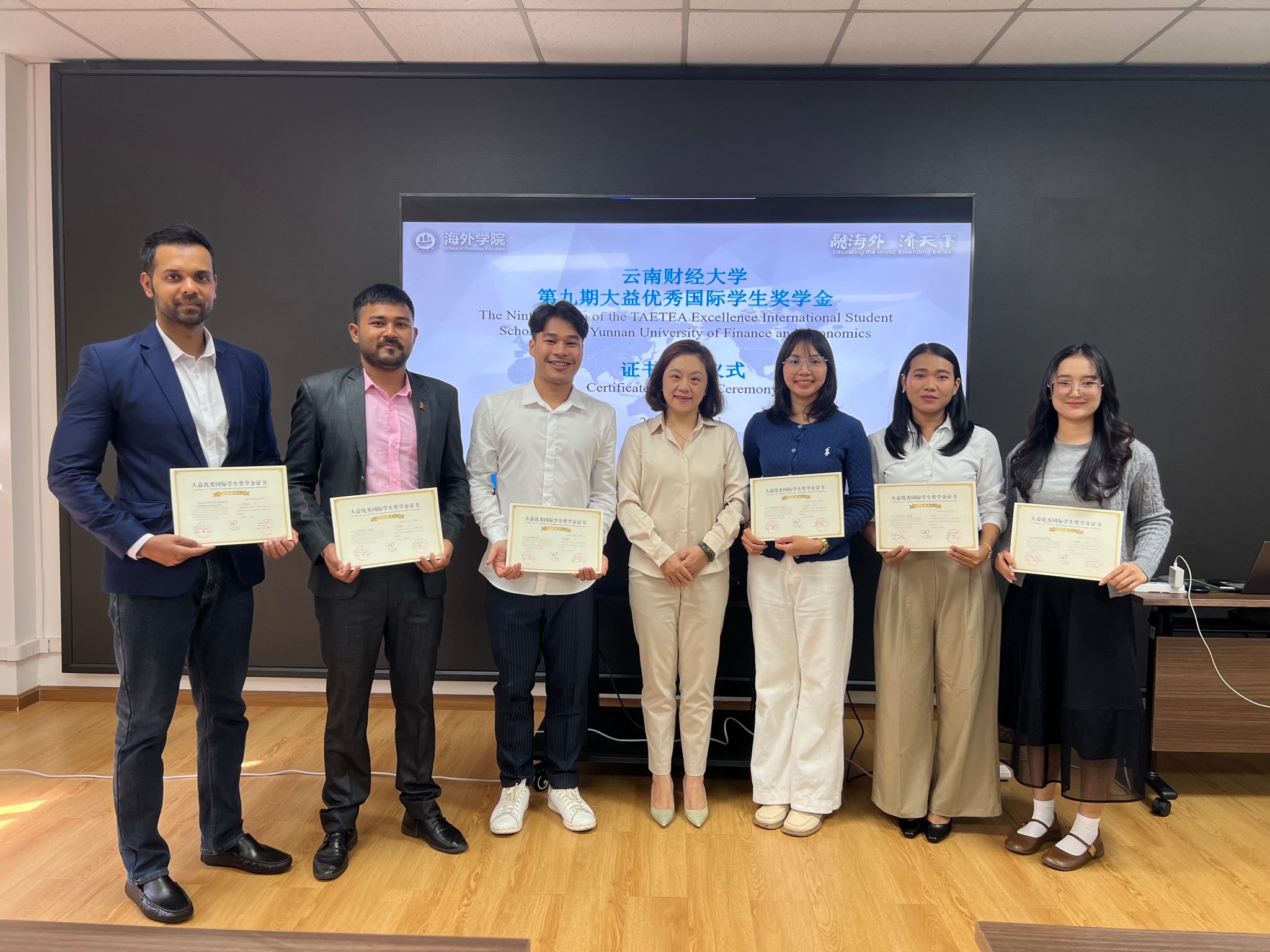 2025年6月6日下午,十大买球官方网站第九期“大益优秀国际学生奖学金证书”颁发仪式在海外学院201教室举行,海外学院副院长李来孺向本期获奖的6名国际学生颁发证书。