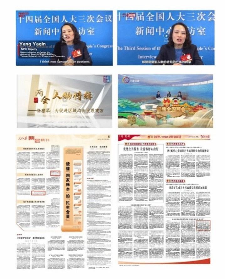 2025年,杨雅琴再接再厉,结合我国社会经济发展新态势,重点关注居民收入差距调节、国家经济高质量发展等领域提出多项建议,同时就促进消费、民生改善等问题接受了人民日报、经济日报、中国新闻网、云南广播电视台等主流媒体的采访和专题报道,在社会和行业引起了积极反响和广泛关注。