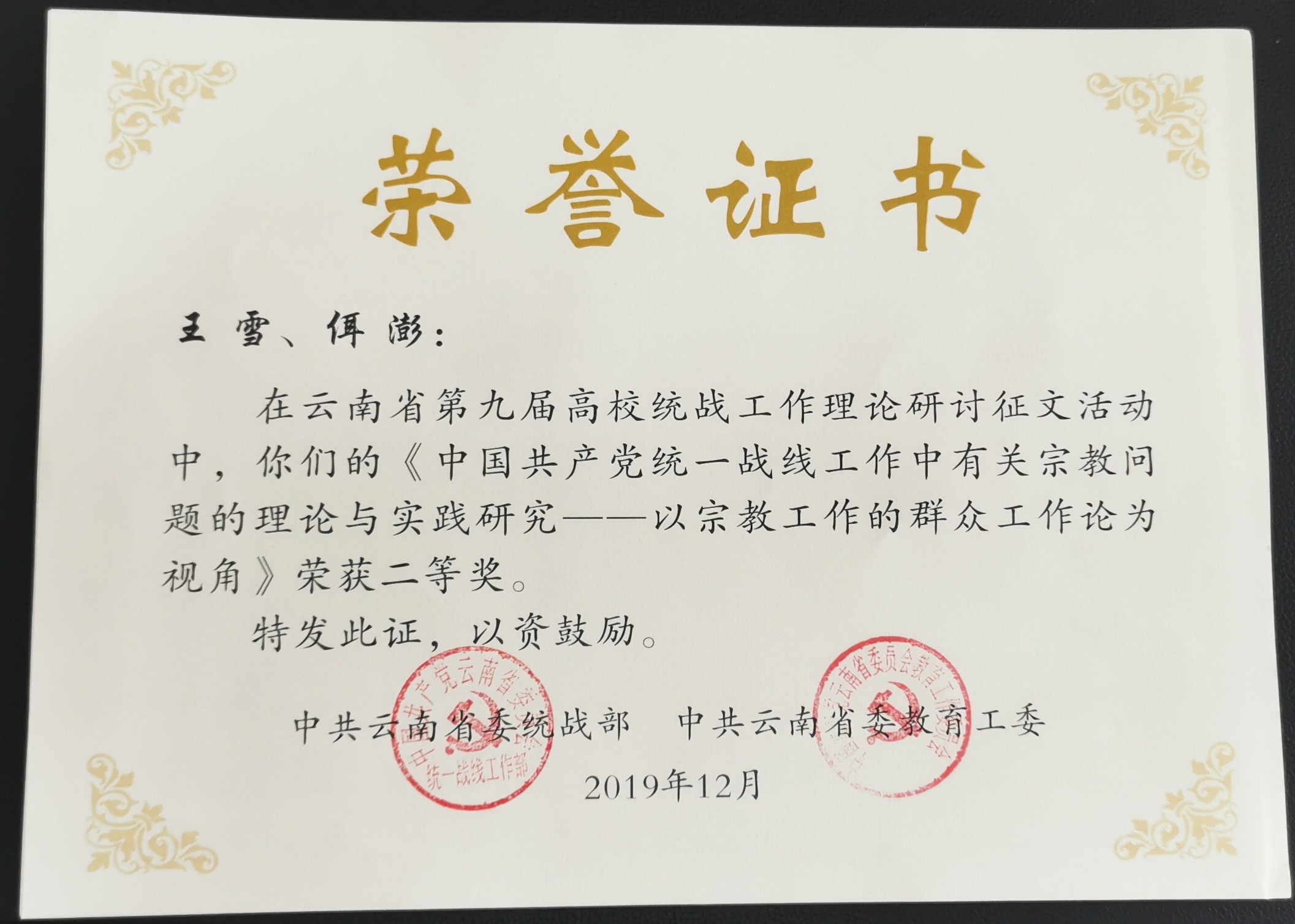近日,云南省委统战部、省委教育工委下发《关于云南省第九届高校统战工作理论研讨征文活动获奖情况的通报》文件,十大买球官方网站教师王雪、佴澎共同完成的论文《中国共产党统一战线工作中有关宗教问题的理论与实践研究——以宗教工作的群众工作论为视角》荣获二等奖。