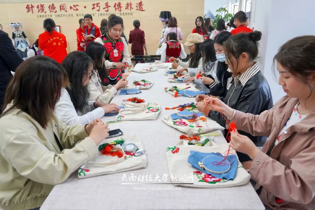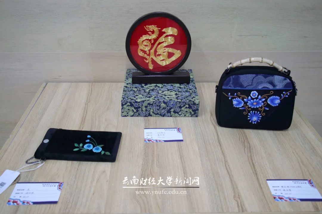在彝绣展览区,打籽绣刺绣工艺的青花瓷、螺旋绣刺绣工艺吉祥如意等一幅幅精美的彝绣展品吸引了不少师生驻足观赏。在绣娘们的指导下,部分师生还现场学习了刺绣的基本技巧和步骤。